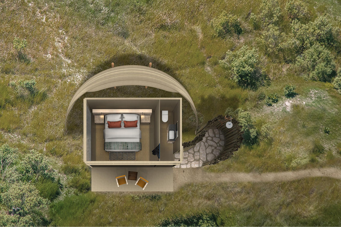 Exclusive-use camp with Three (3) x 1 bedroom Tents with Twin and/or Double beds available, en suite bathroom with flush toilet, hand basin, and outdoor bucket shower. Equipped with a retractable canvas roof to stargaze on clear nights. Pared-back tents with all the comforts you need, including comfortable beds.