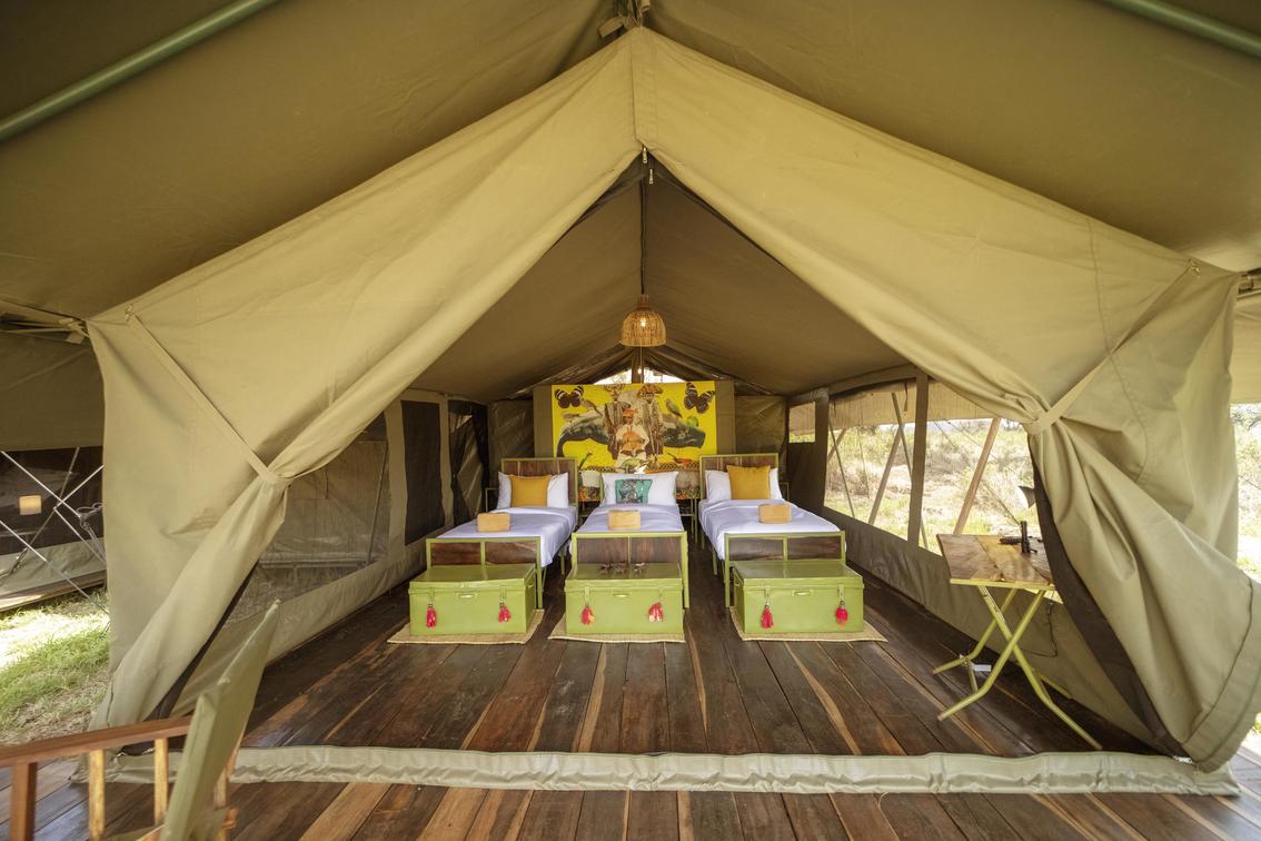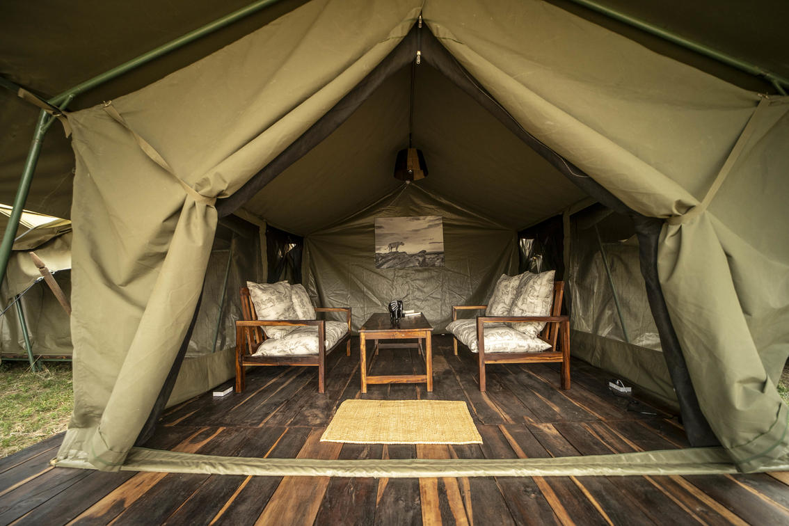 Our Family tent can accommodate up to 6 guests. The tent is connected by a 10 meter walk-way with a private lounge in the middle. The tent is set off to the side of the classic tents for complete privacy. The lounge area can accommodate private dinners for family and there is a private fire pit. Flushable toilets and safari showers in each tent. Measurements 4.5 x 7 meters per tent