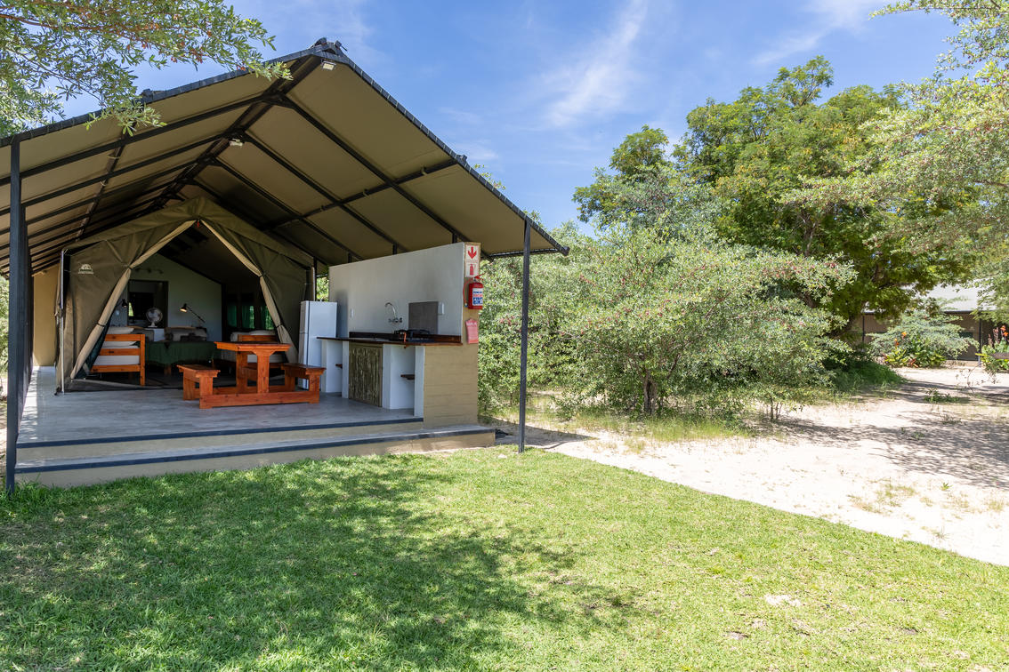 Each safari tent is equipped with four beds, en-suite bathroom, and self-catering kitchen on the veranda.