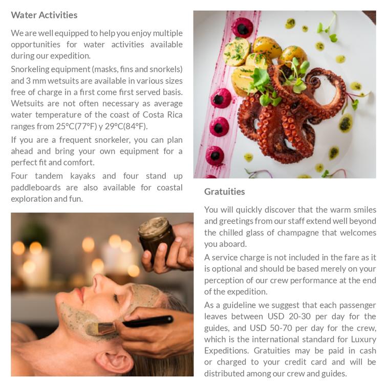 Day 7: Relax at Los Mogos natural spa and mangrove kayaking on Río Esquinas, with beachside lunch and marine activities. Farewell dinner onboard.