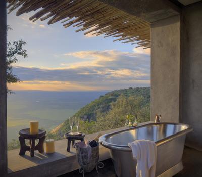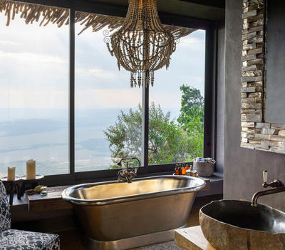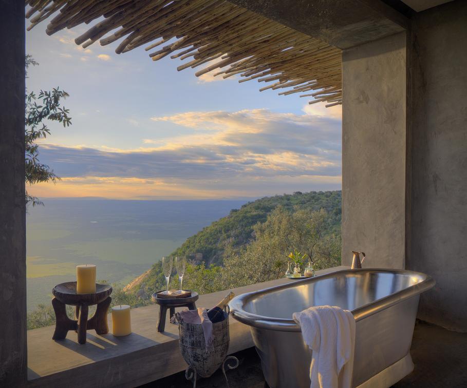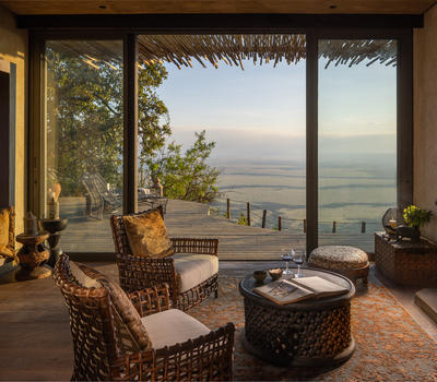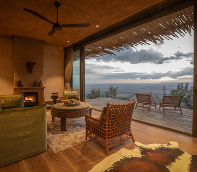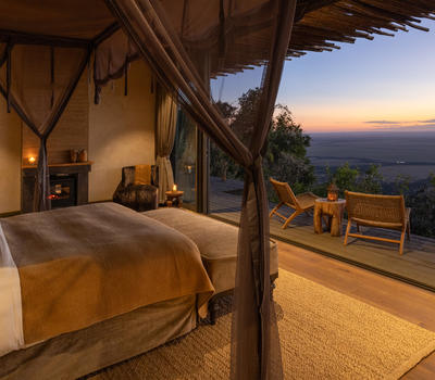 Nabo is Wild Hill's two-bedroom suite, offering a perfect luxurious retreat for families or groups wanting their own private space. Enter a spacious lounge area with sliding doors opening to a verandah overlooking the endless views across the Mara. Cosy seating, fireplace, bluetooth speaker and inspiring books await, along with a mini fridge filled with drinks and snacks and a tea and coffee-making area. The two en-suite bedrooms lead to each side of the lounge, offering privacy alongside the security of all being under one roof. The suite bedrooms and bathrooms follow a similar design to the individual suites - plentiful storage area with wardrobes and cupboard space, dressing tables, mosquito netting and en-suite bathrooms with indoor and outdoor showers and panoramic bathtubs.
