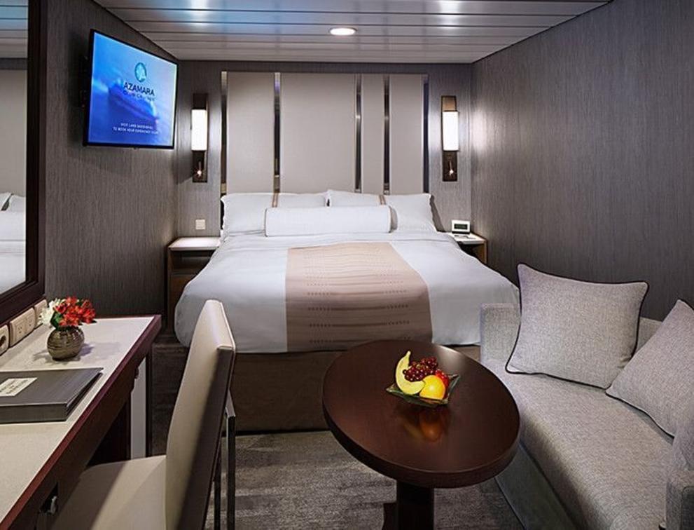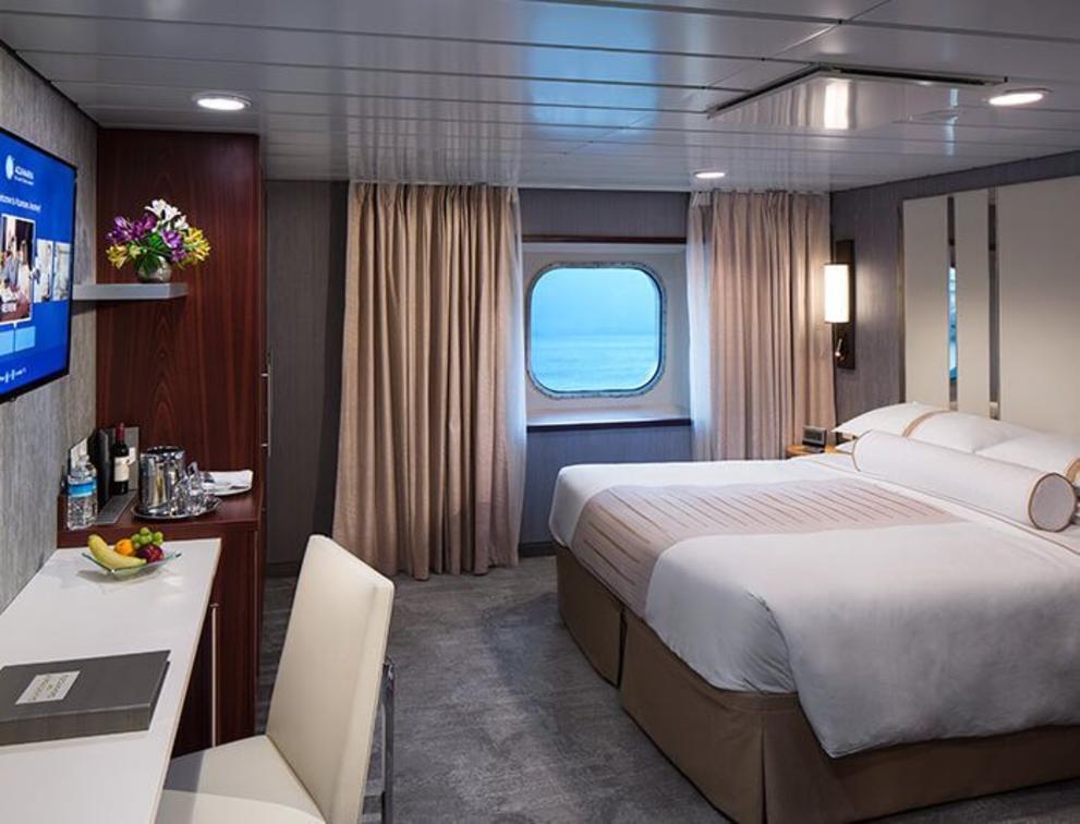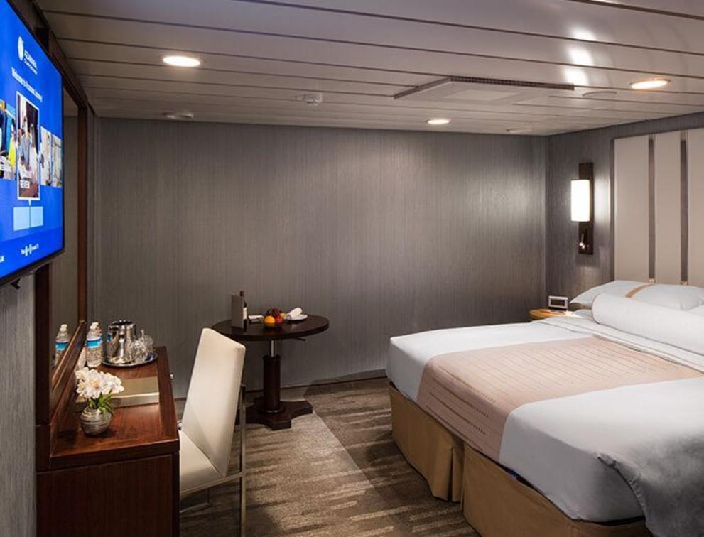 The comfortable Club Interior Staterooms each feature two lower beds that can be converted to a queen-size bed, a 40” flat-screen TV, fridge with a mini-bar, thermostat-controlled air conditioning, a direct-dial telephone with voicemail, in-room safe, hand-held hairdryer, and USB ports under the bedside reading lamps.