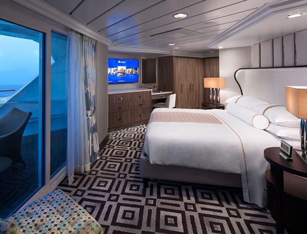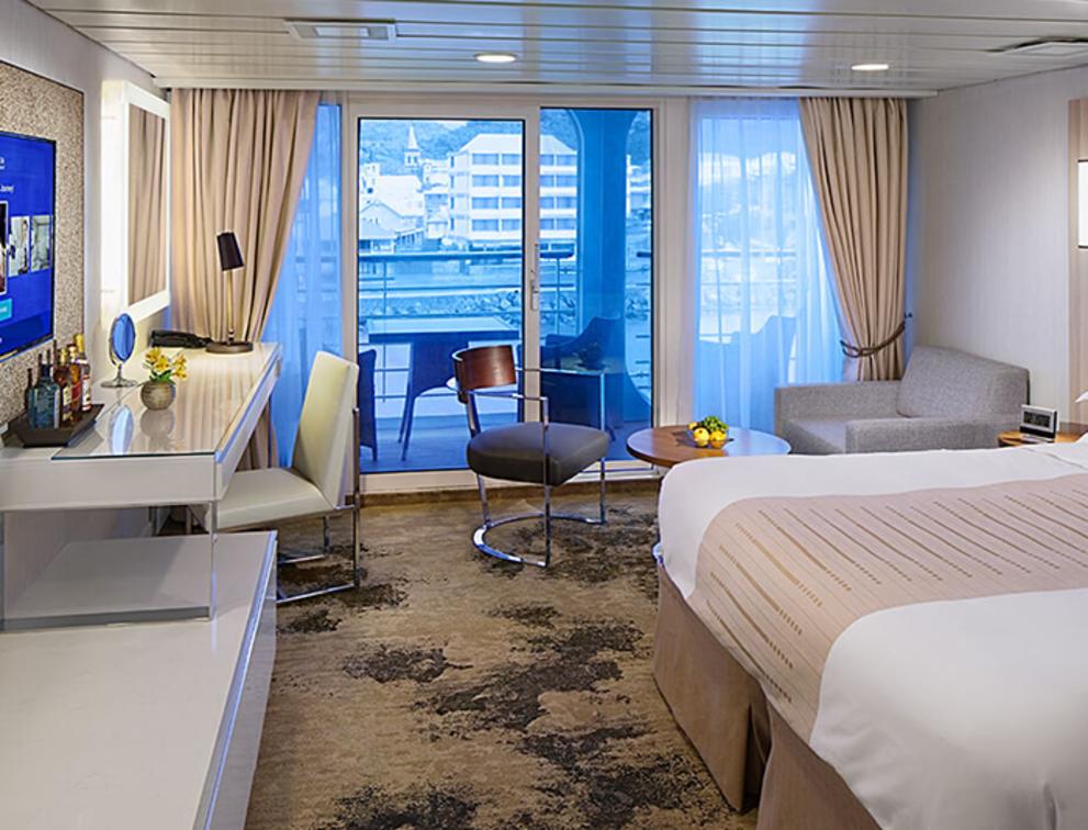 The Club Deluxe Veranda Staterooms are all equipped with two lower beds that can be converted to a queen-size bed, a comfortable sitting area with a 40” flat-screen TV, veranda, fridge with a mini-bar, thermostat-controlled air conditioning, a direct-dial telephone with voicemail, in-room safe, hand-held hairdryer, and USB ports under the bedside reading lamps