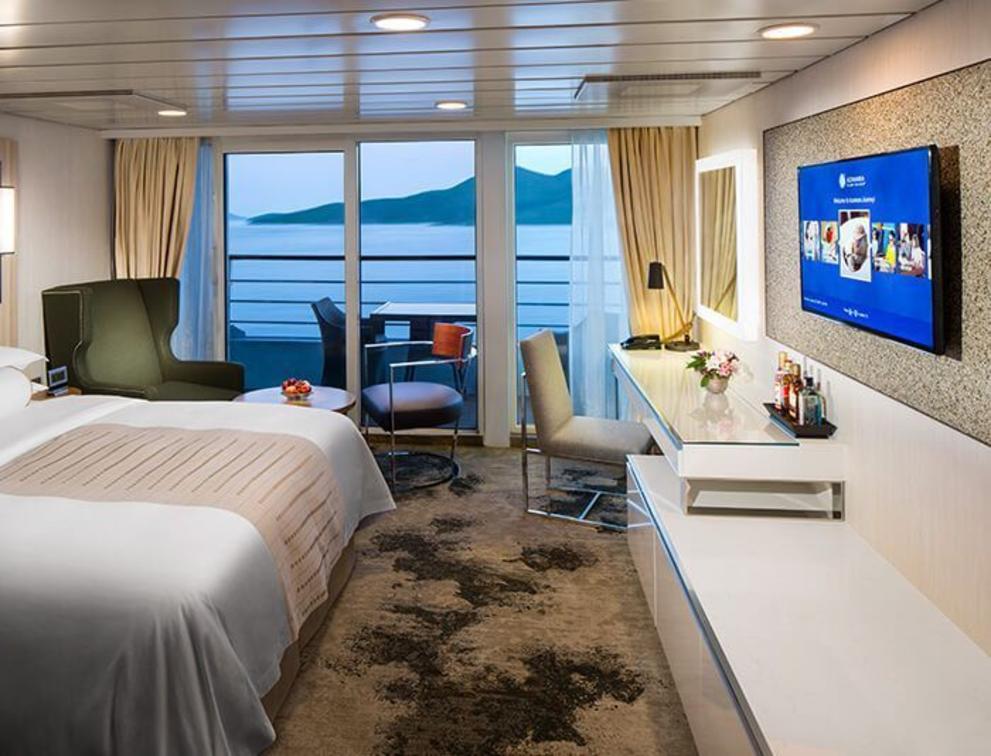The Club Deluxe Veranda Staterooms are all equipped with two lower beds that can be converted to a queen-size bed, a comfortable sitting area with a 40” flat-screen TV, veranda, fridge with a mini-bar, thermostat-controlled air conditioning, a direct-dial telephone with voicemail, in-room safe, hand-held hairdryer, and USB ports under the bedside reading lamps.