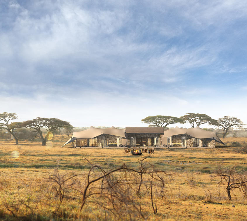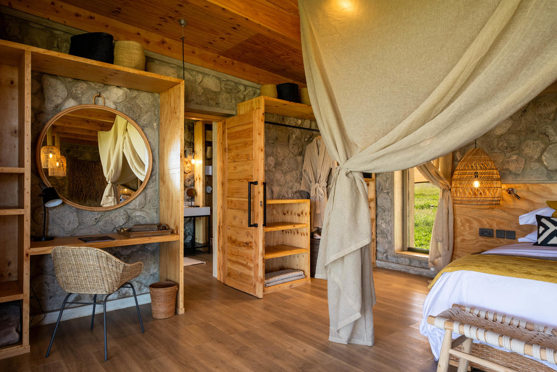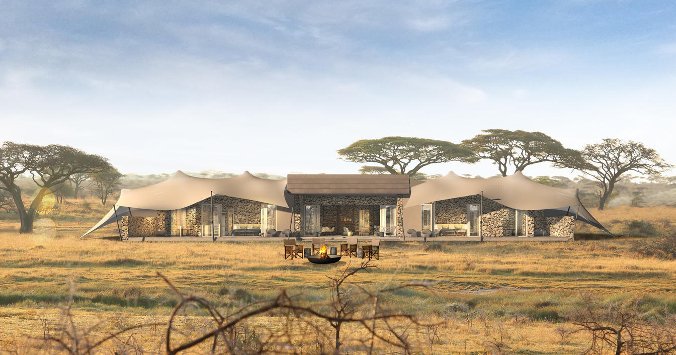 The tented suite features two full-size double bedrooms, a mosquito net and wall fan, a central lounge and dining area, and a spacious deck with a sunken firepit. Two additional single beds can be added for children. The en-suite bathroom includes a double vanity and indoor shower, as well as a private outdoor bathtub. Toiletries are provided.