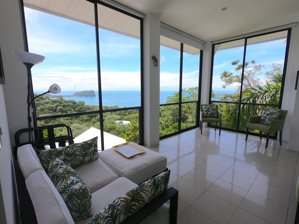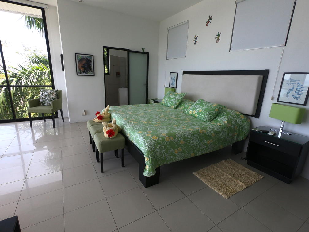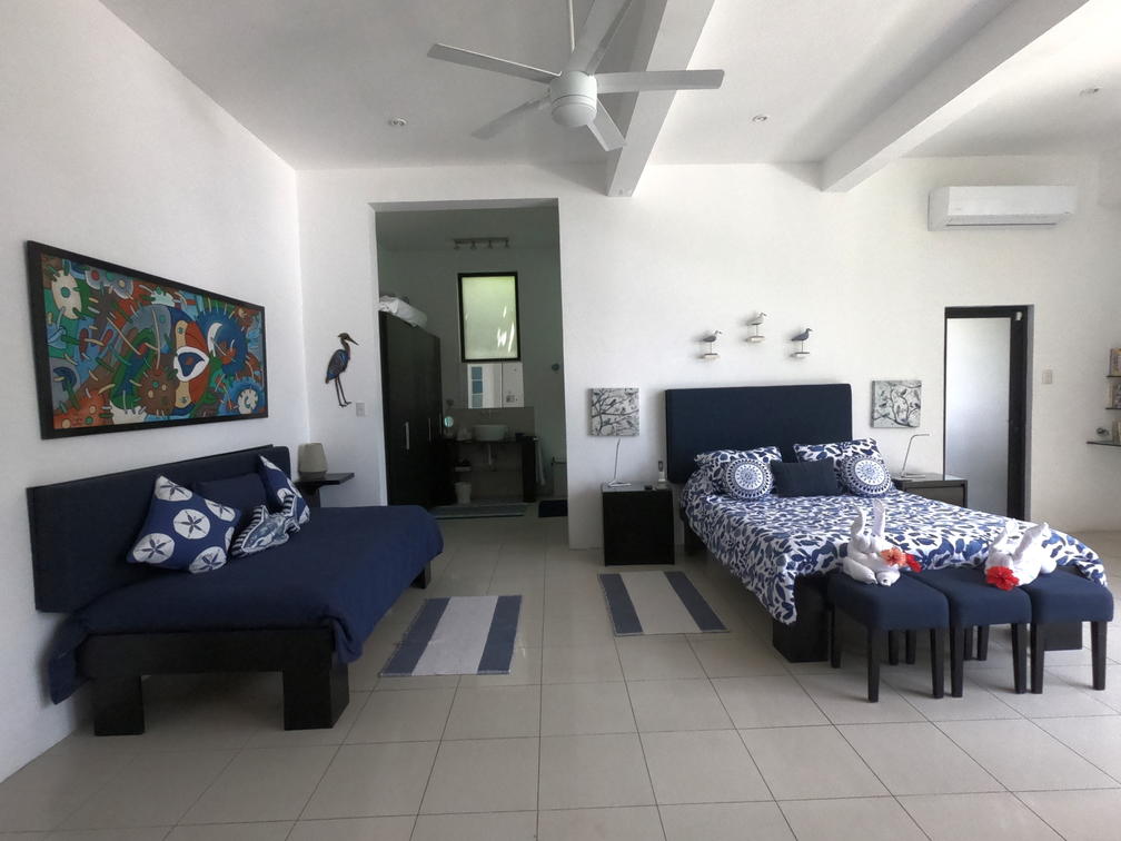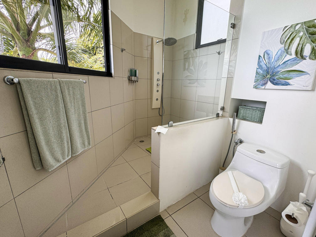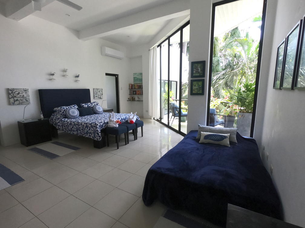 The third bedroom located one floor below the main level has a queen size bed, a twin/day bed, a loveseat that converts into a twin bed, a private bathroom and air conditioning. The small balcony with garden view is the perfect spot to observe monkeys foraging for fruit in the nearby palm trees.