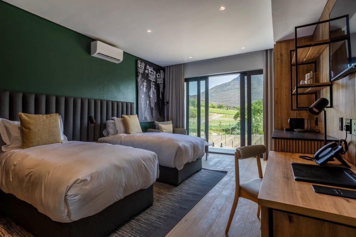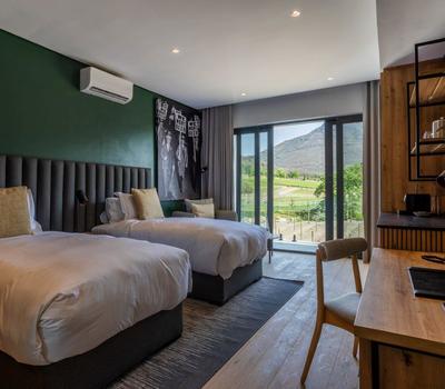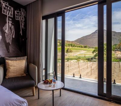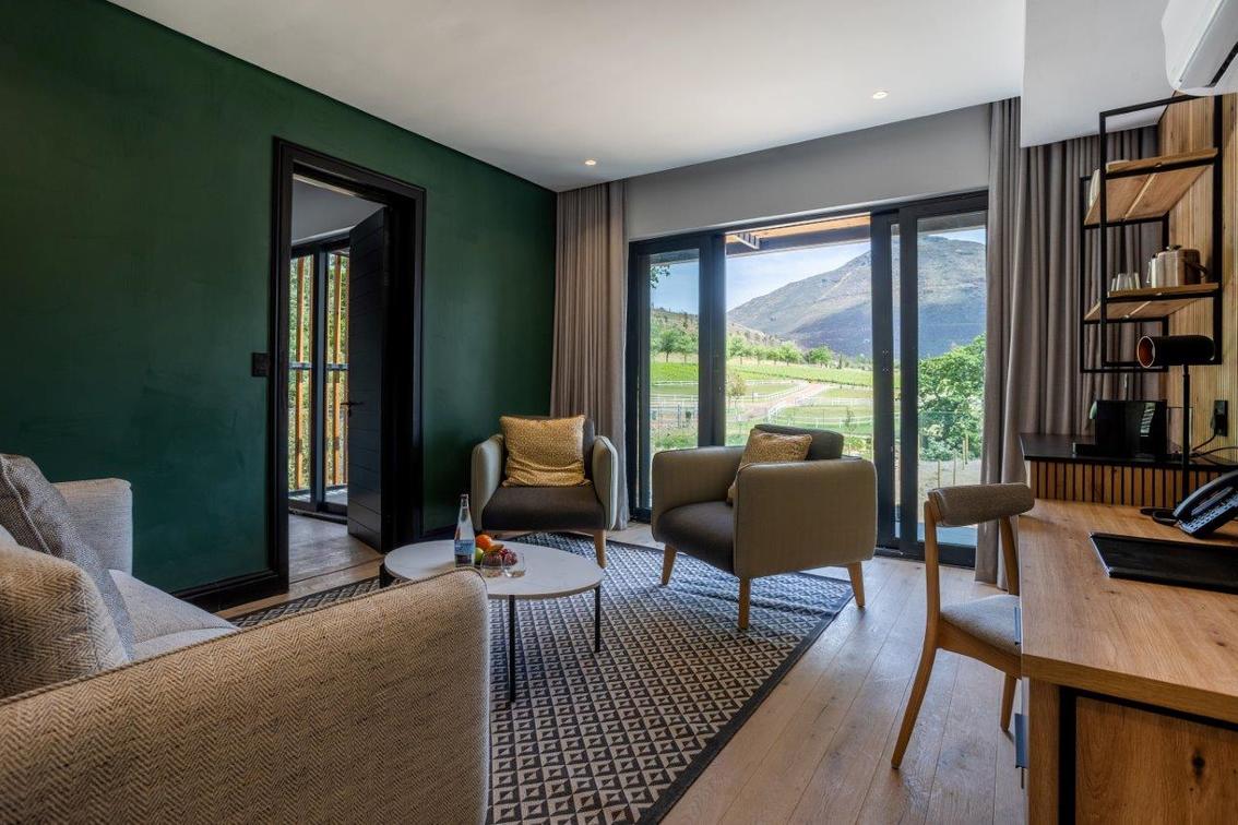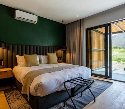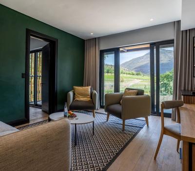 Our Executive Suite offers a luxurious and spacious retreat, featuring a dedicated lounge area with a large TV, fireplace, and an inviting ottoman. This elegantly designed suite boasts a larger balcony, providing stunning views of the surrounding vines and mountains. With modern amenities, including complimentary Wi-Fi and a work desk, it’s perfect for both relaxation and productivity. Ideal for discerning travelers, this suite promises an unforgettable experience in a breathtaking setting.
