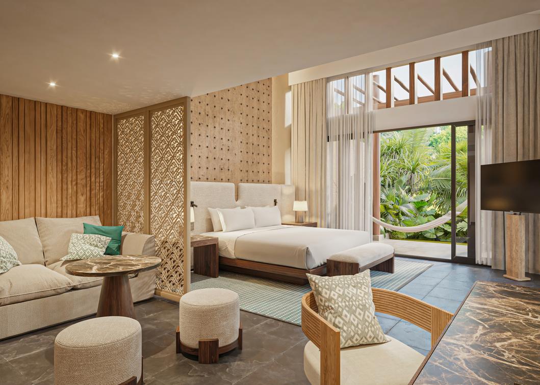 Our Bliss Pool Villa offers a retreat where you can connect with nature, feeling the jungle's energy and the lagoon's tranquility each time you step outside. Whether savoring your morning coffee on the sundeck or taking a dip in your full-sized pool, every moment is designed for relaxation. Unwind in your bubbling jet pool, lounge on the hammock or the cozy Bali bed, and indulge in your fully stocked minibar.