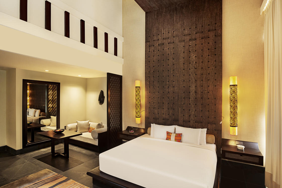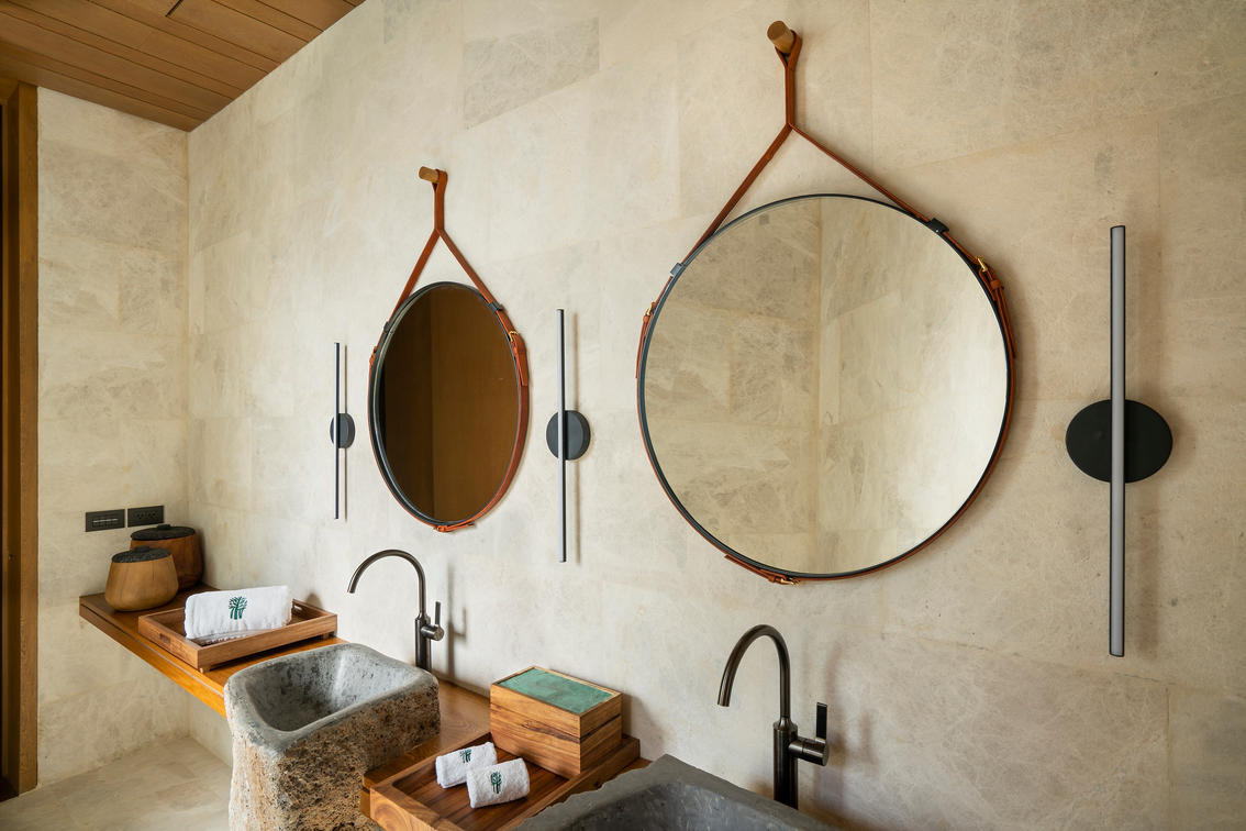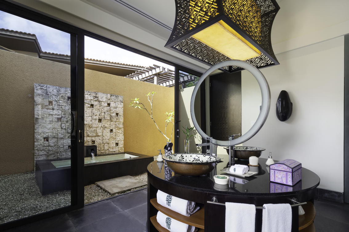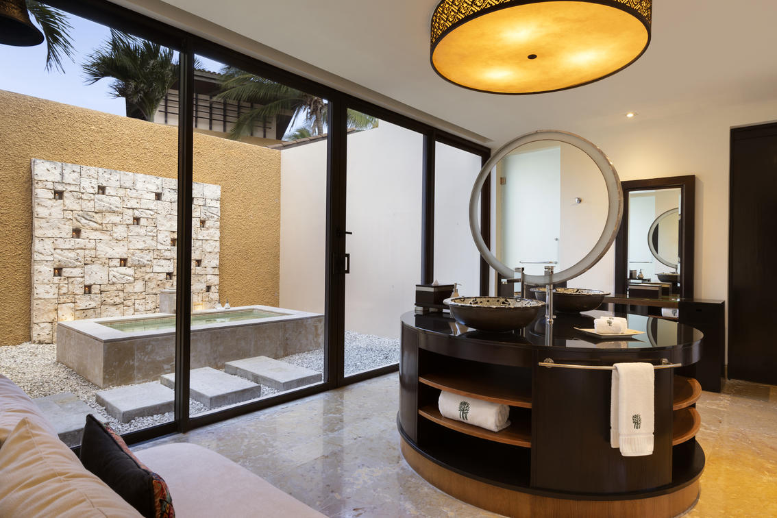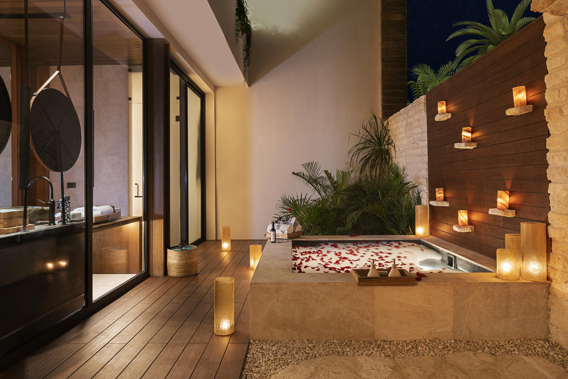 The two-story layout seamlessly blends with nature, while an outdoor bathtub, open-air rain shower, and sun-drenched solarium create an immersive wellness experience. Inside, elegant interiors and a beautifully designed bathroom open to a private back terrace, where a bubbling jet pool awaits for moments of pure relaxation.