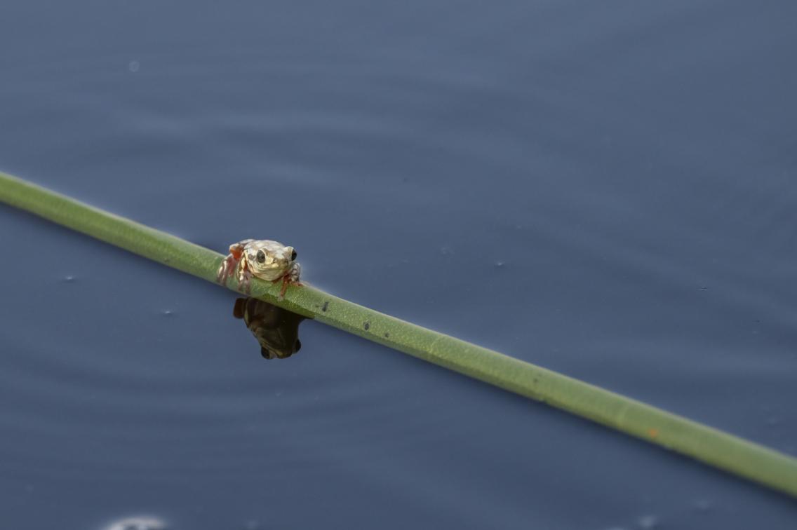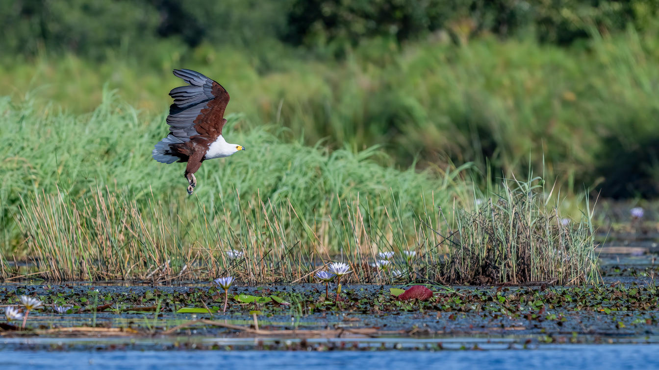 Heading northwards, the landscape unfolds in quiet splendour. The mirrored reflections of papyrus and clouds dance on the water's surface, punctuated by the gentle splash of the boat and the occasional call of an African fish eagle. Water lilies float delicately along our path, and small palm-fringed islands appear like mirages — often home to red lechwe, browsing elephants, hippos wallowing in the shallows, and the occasional crocodile basking on the banks.