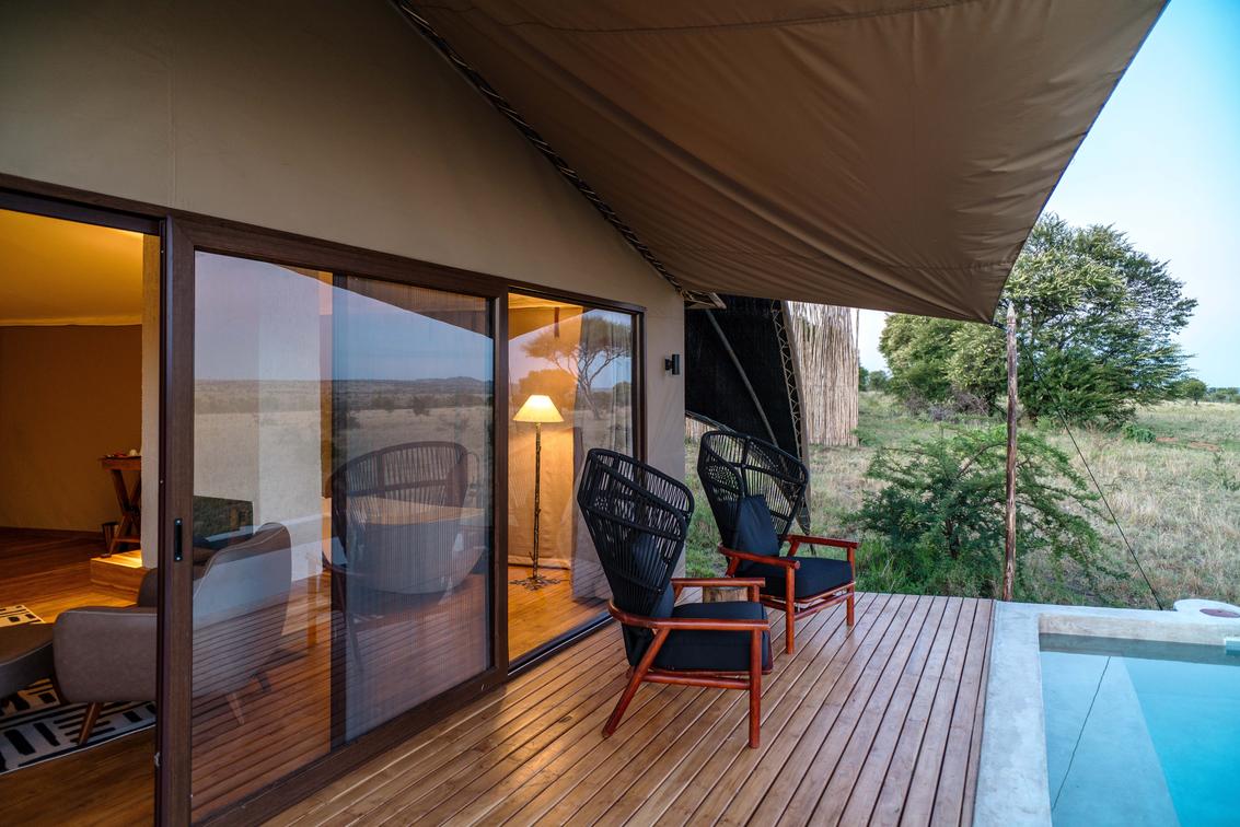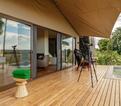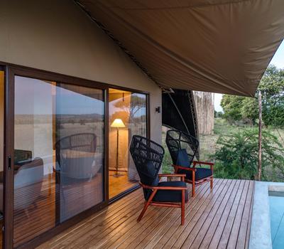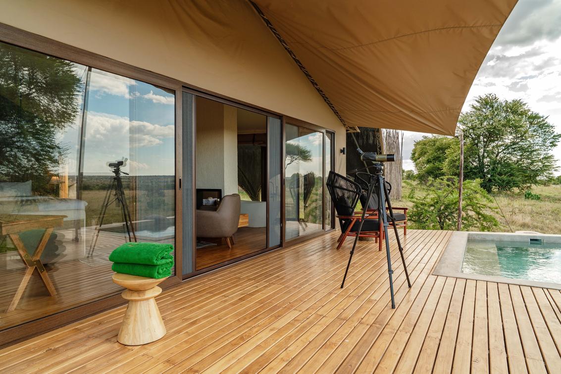 - A well-stocked mini bar and private deck overlooking the endless plains