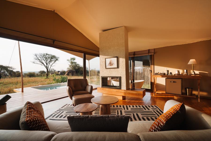 Warangi Ridge, located in the heart of the Central Serengeti, offers a luxurious retreat amidst the beauty of the Serengeti. The accommodation features 20 insulated tented suites, each with a private deck, private bathtubs, cosy fireplaces, ceiling fans, a plunge pool, and panoramic views of the savannah. There is an on-site restaurant where guests can enjoy meals. The property includes a library lounge, a lounge bar, a yoga deck, an open-air gym, and a spa. Activities at Warangi Ridge include day and night game drives, river walks along the Orangi River, specialized bird walks, and eco-nature walks.
