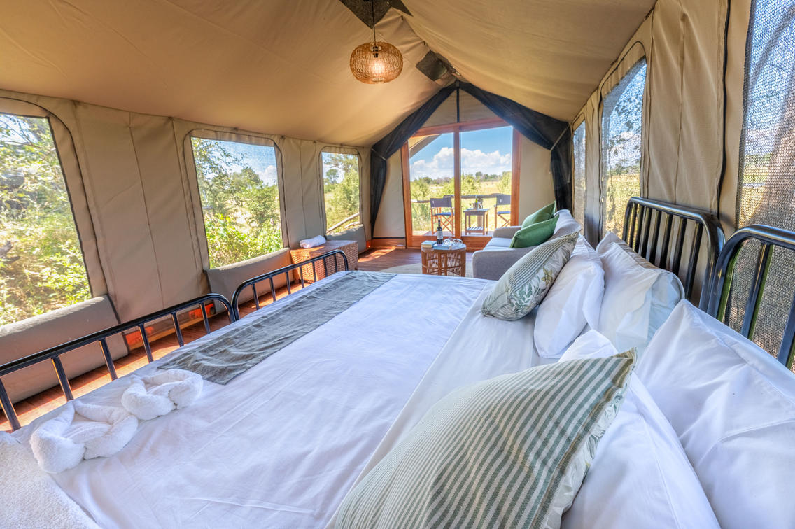 Each tent is tastefully furnished with comfortable beds, quality linens, and safari-style touches reflecting regional heritage. En-suite bathrooms feature hot water, flush toilets, and invigorating safari showers—blending comfort with rustic authenticity. Large mesh windows and private verandas offer uninterrupted views, natural airflow, and a deep sense of immersion in the wild.