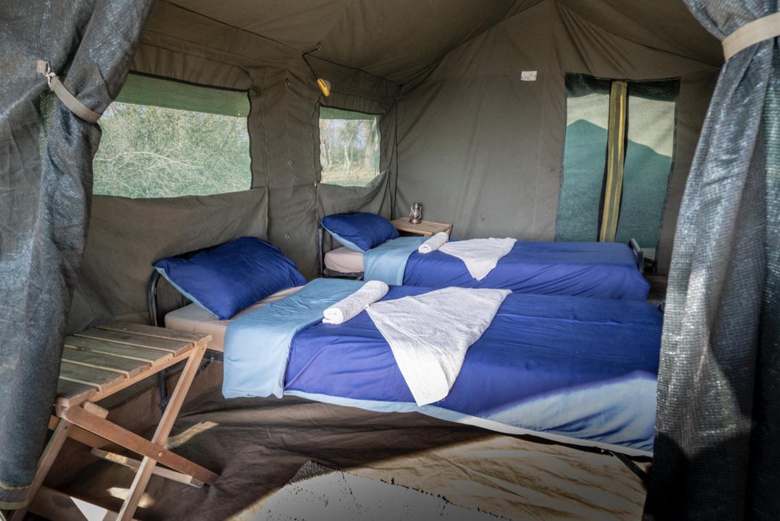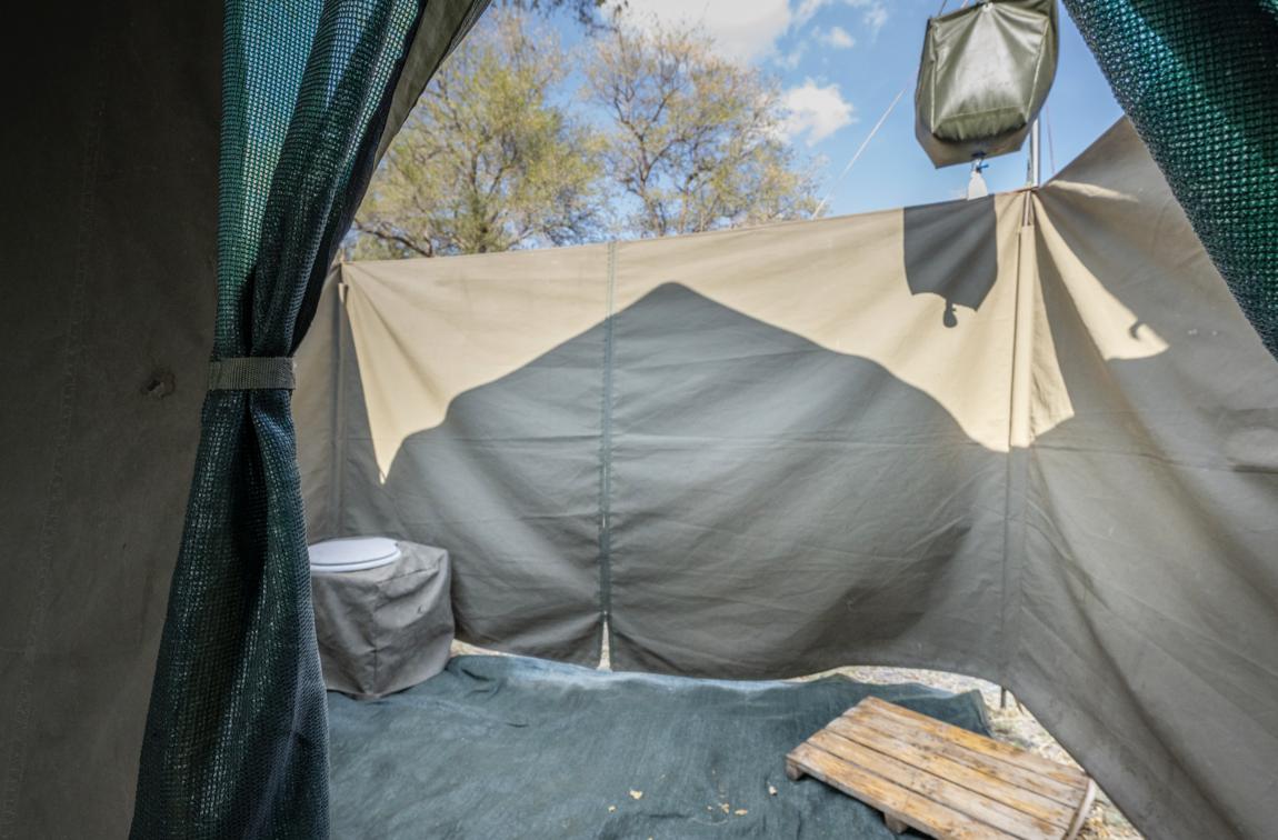 Inside, guests will find comfortable, full-size beds with high-quality linen and warm duvets—ideal for cool Savuti evenings. Each tent is furnished with bedside tables, luggage racks, and ambient solar-powered lighting, creating a cosy and welcoming retreat after a day of adventure. Large mesh windows provide both ventilation and views, allowing guests to feel connected to the surrounding landscape while remaining protected and secure.