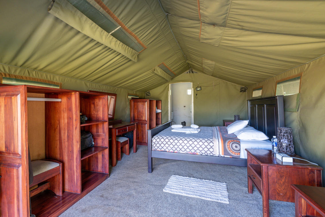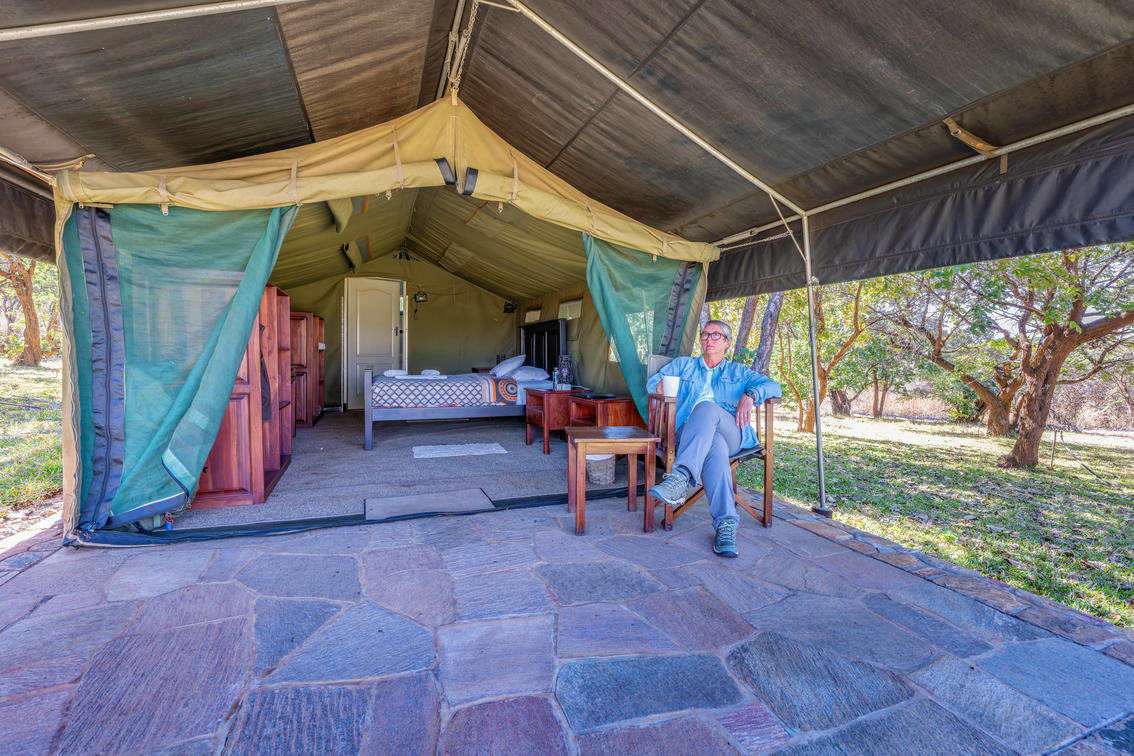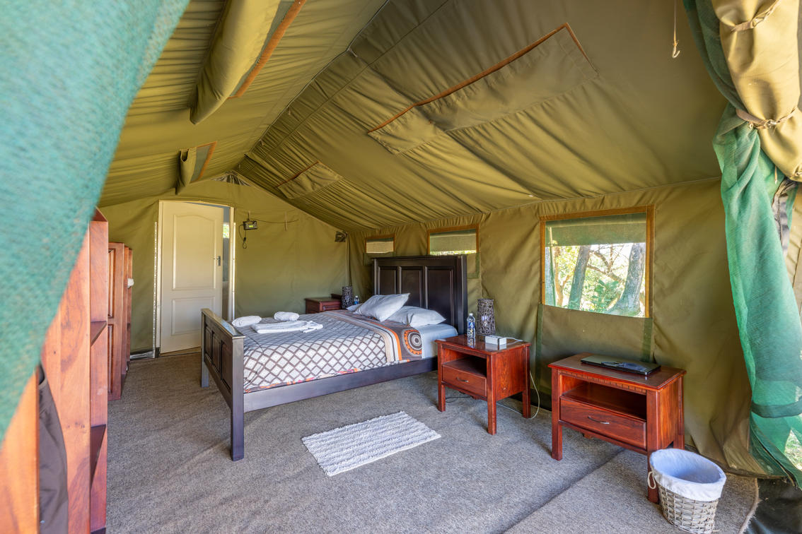 The camp sleeps up to eight guests in four spacious, well-appointed safari tents. Each tent is perched on a sturdy concrete platform, offering both safety and elevation. Inside, the décor is warm and classy, with cozy bedding and thoughtful furnishings that reflect the spirit of the African bush. Attached ensuite bathrooms with flush toilets and hot-water showers—powered by eco-friendly solar geysers—bring a welcome touch of modern convenience to the wilderness experience.