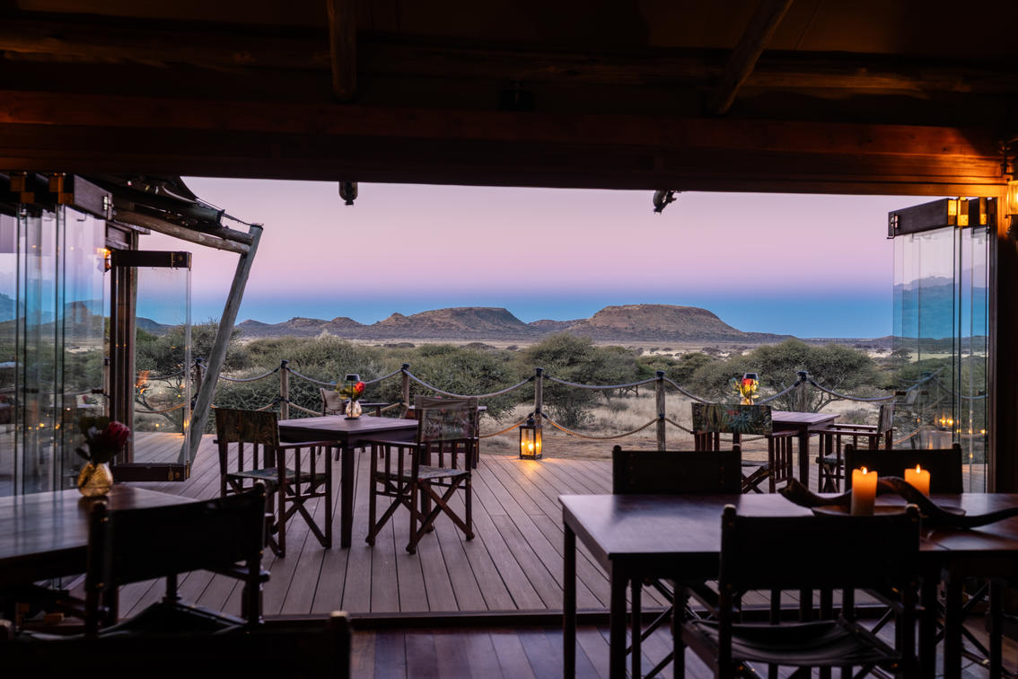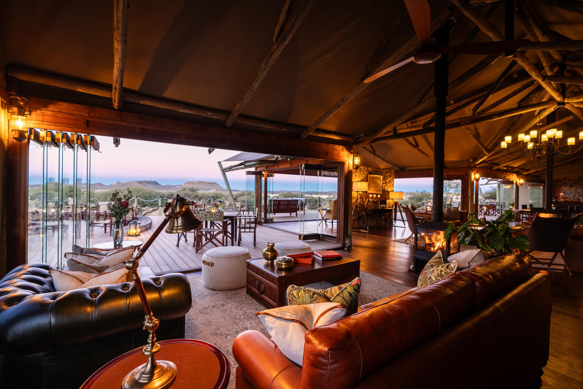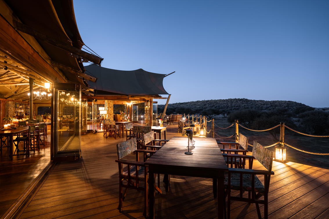 The restaurant at Maloba’s main lodge is designed as an elegant yet welcoming space where the rhythm of the wilderness shapes each meal. With floor-to-ceiling views of the Kalahari, guests dine against a backdrop of endless skies and roaming wildlife.