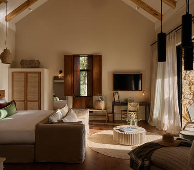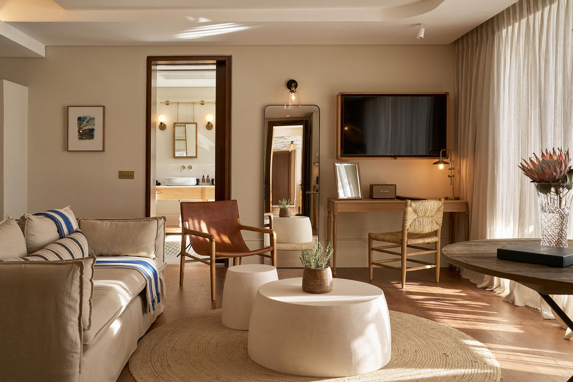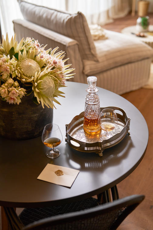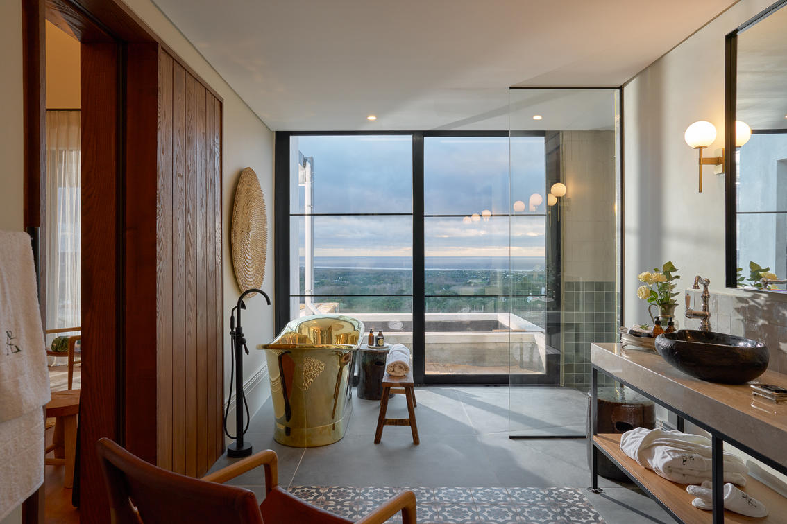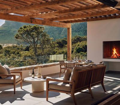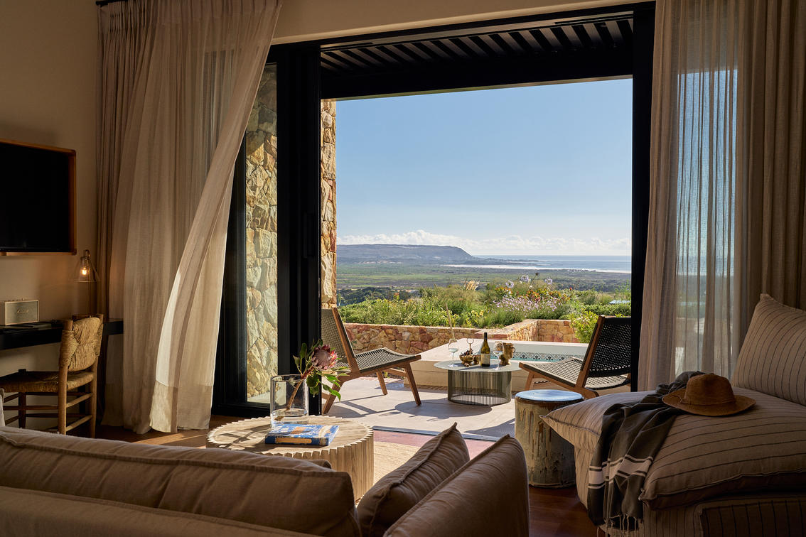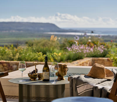 One Penthouse Suite, 180sqm. Unparalleled luxury, comprising of a lounge, dining room, study, kitchen, and two log burning fireplaces. A large deck with a four poster daybed and private heated plunge pool, with spectacular mountain, vineyard and ocean views.