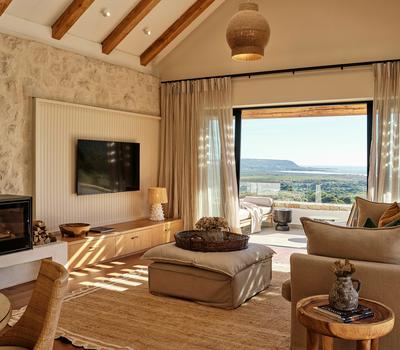 Two Luxury Suites, all 60sqm, with ocean & vineyard views, en-suite with indoor shower & bath (some with outdoor shower), log burning fireplaces and a private deck extending from each suite. The suites can be set up as twins of a king.