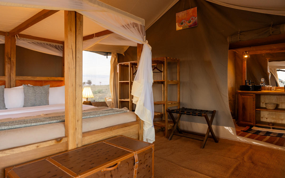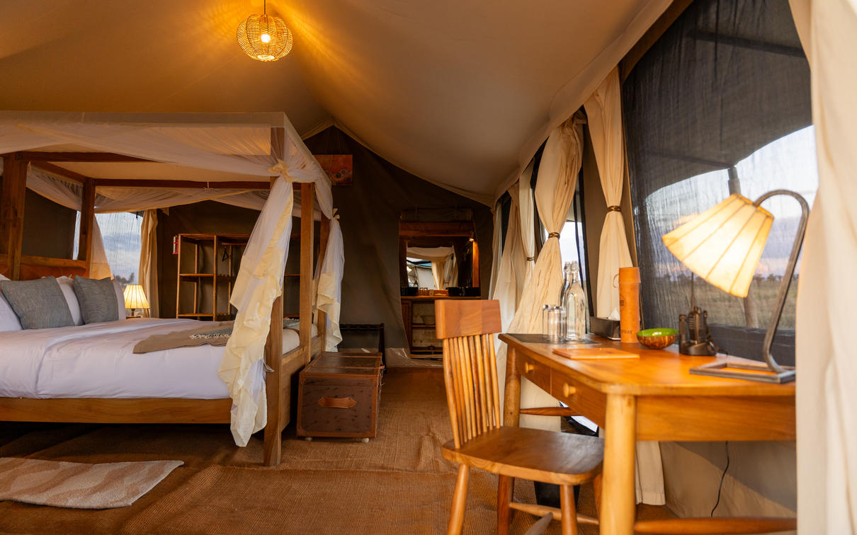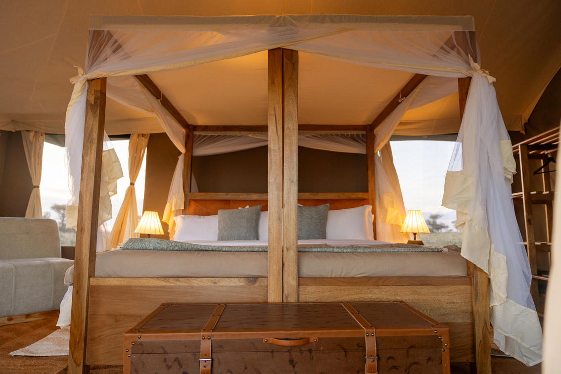 Two interconnecting handmade canvas tents with an extra large emperor-sized bed in each, an en suite bathroom with modern flush toilets, double sinks and safari bucket showers in each.