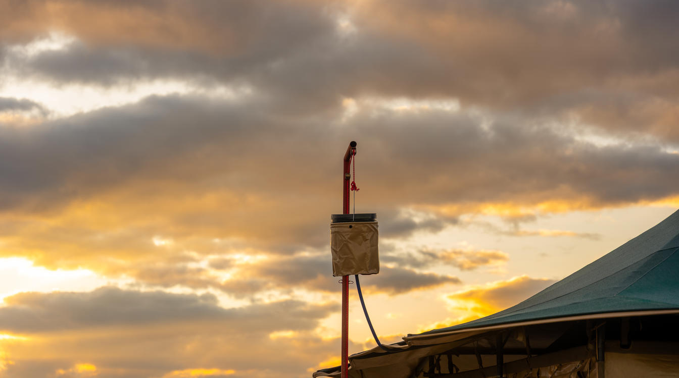 Handmade canvas tents with an extra large emperor-sized bed and an en suite bathroom with modern flush toilets, double sinks and safari bucket showers.