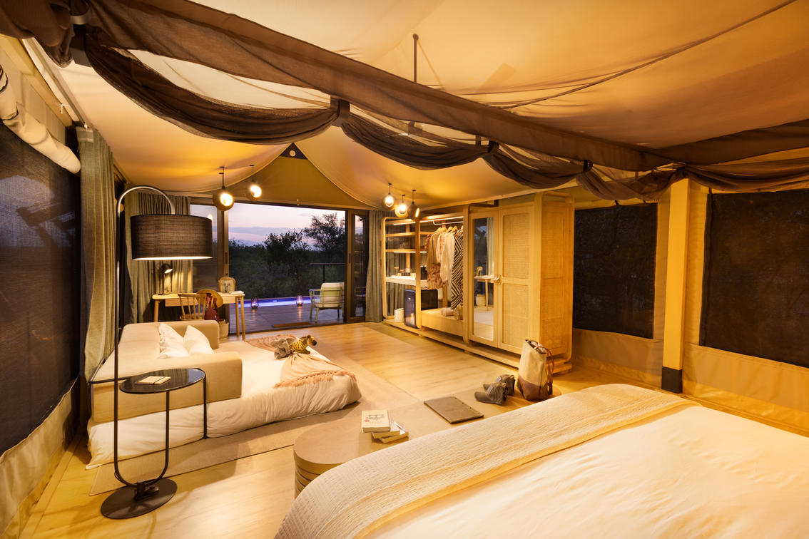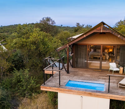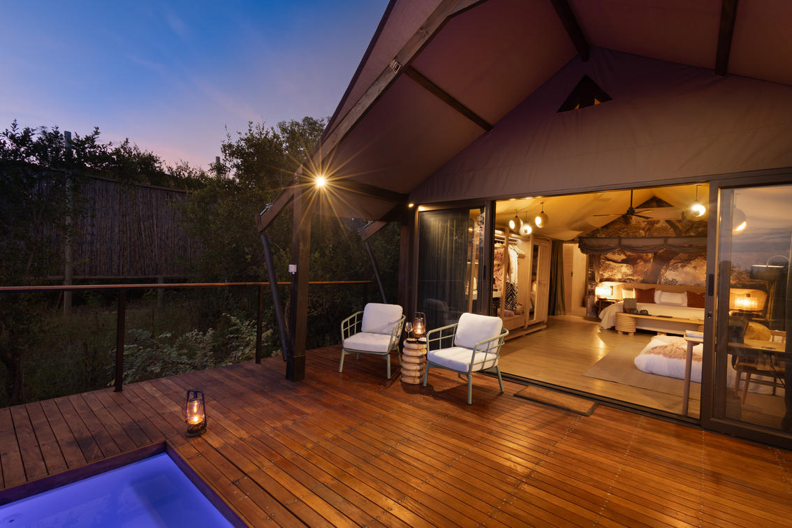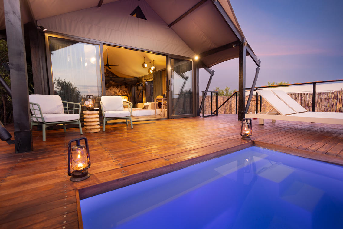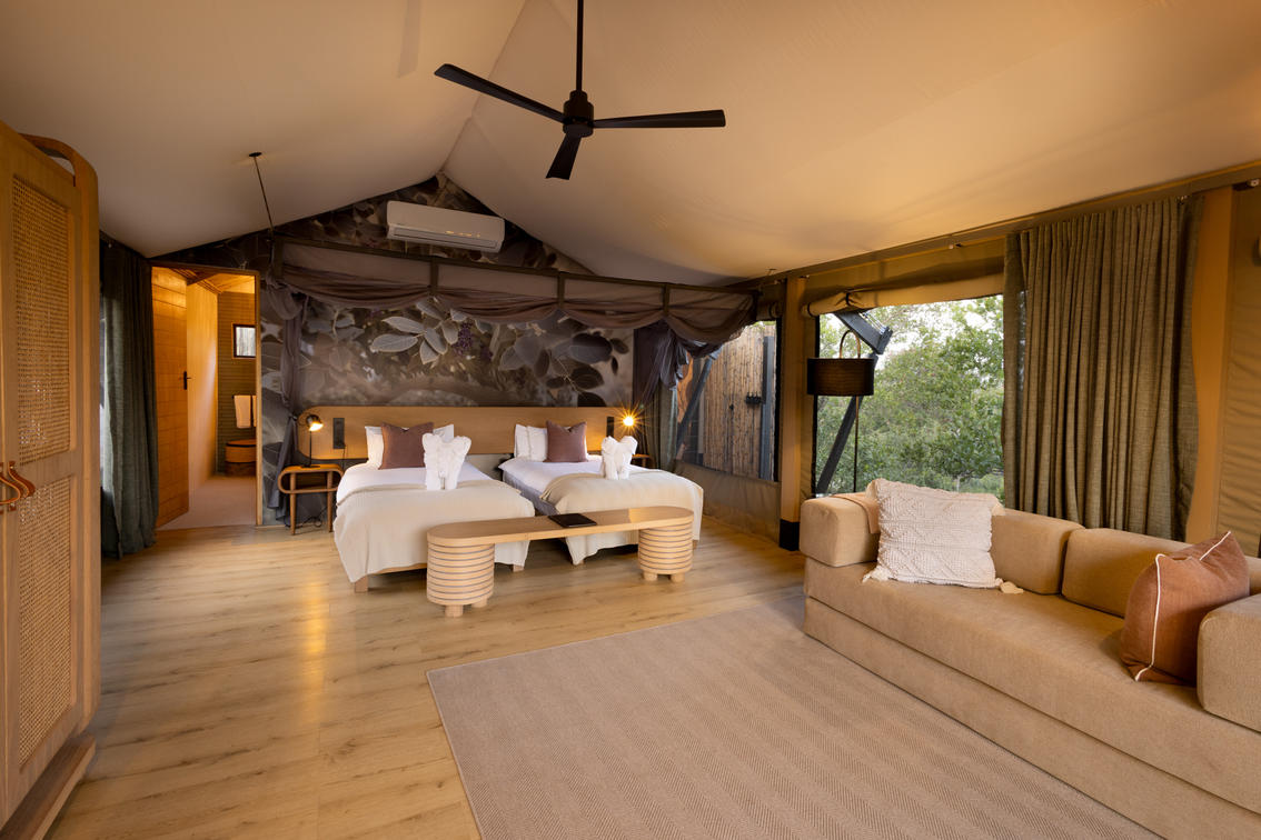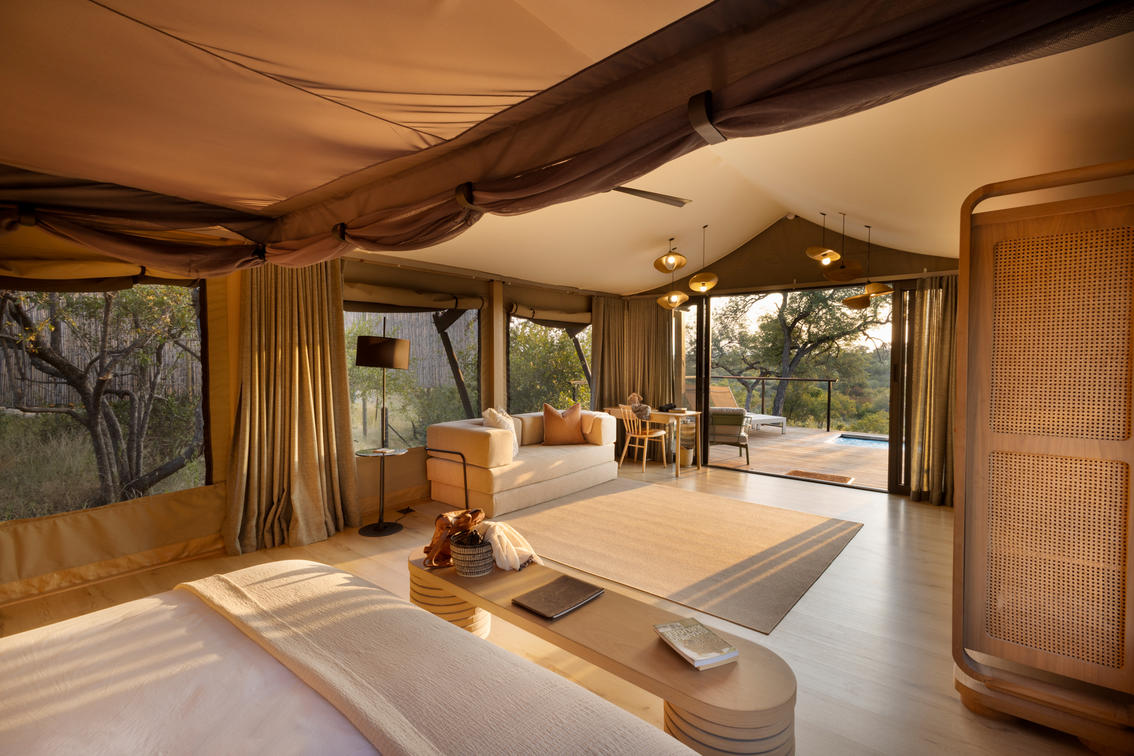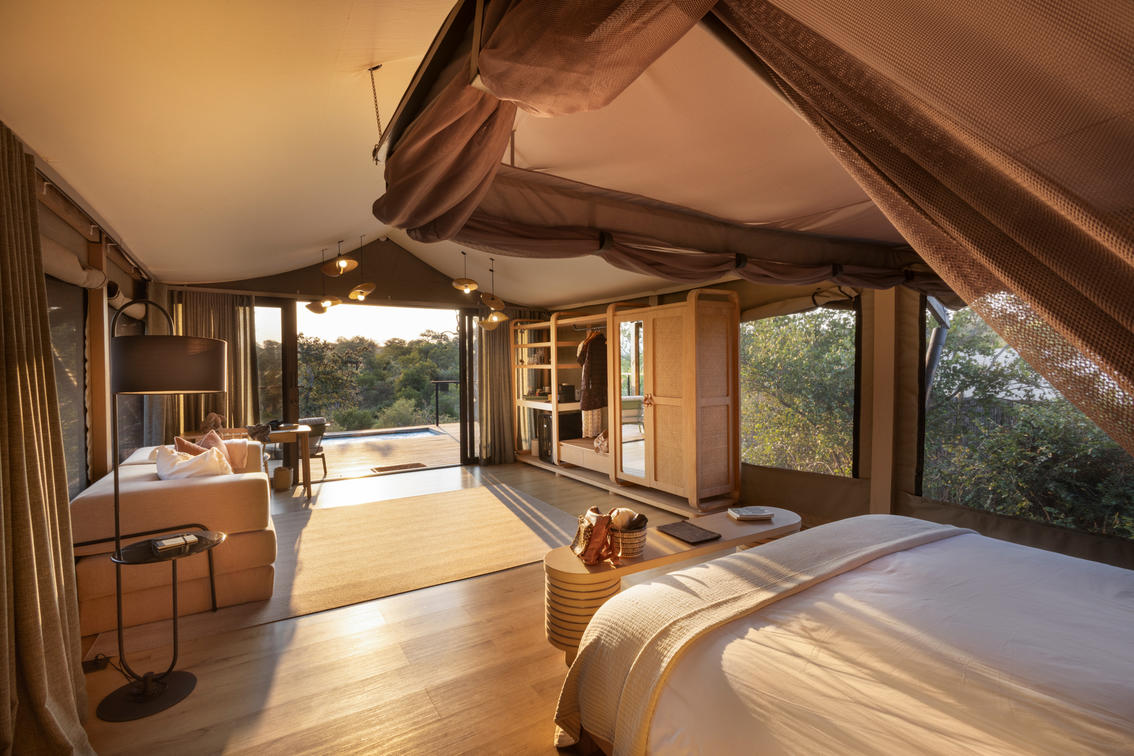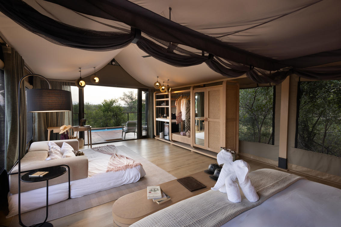 Inspired by different trees indigenous to the Kruger area, the tented suite includes an extra length Super King bed (can split into 3/4 beds) and a sleeper couch. In addition to the luxurious modern decor, highlighting features include a plunge pool and outdoor shower.