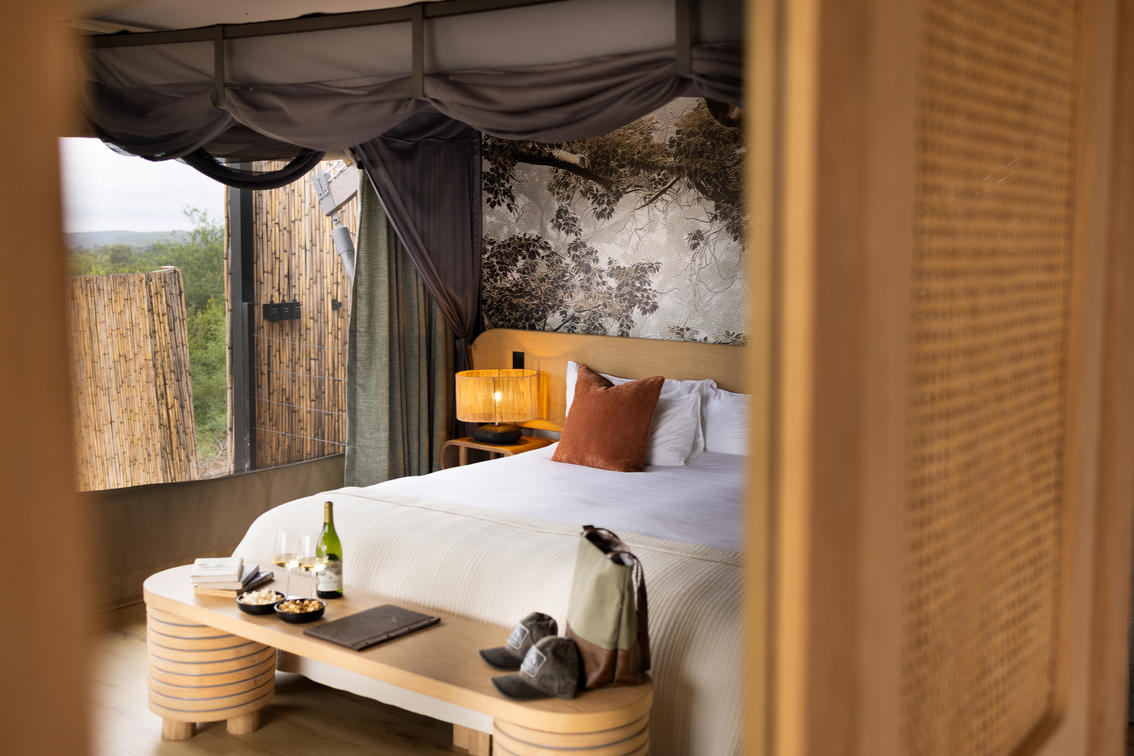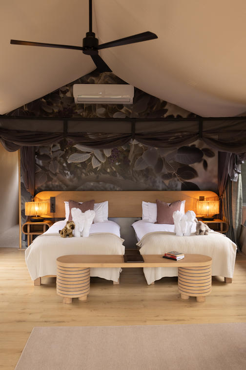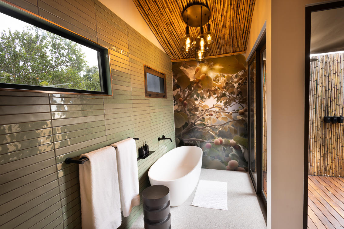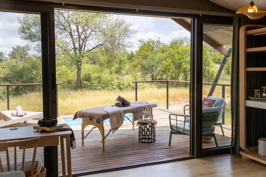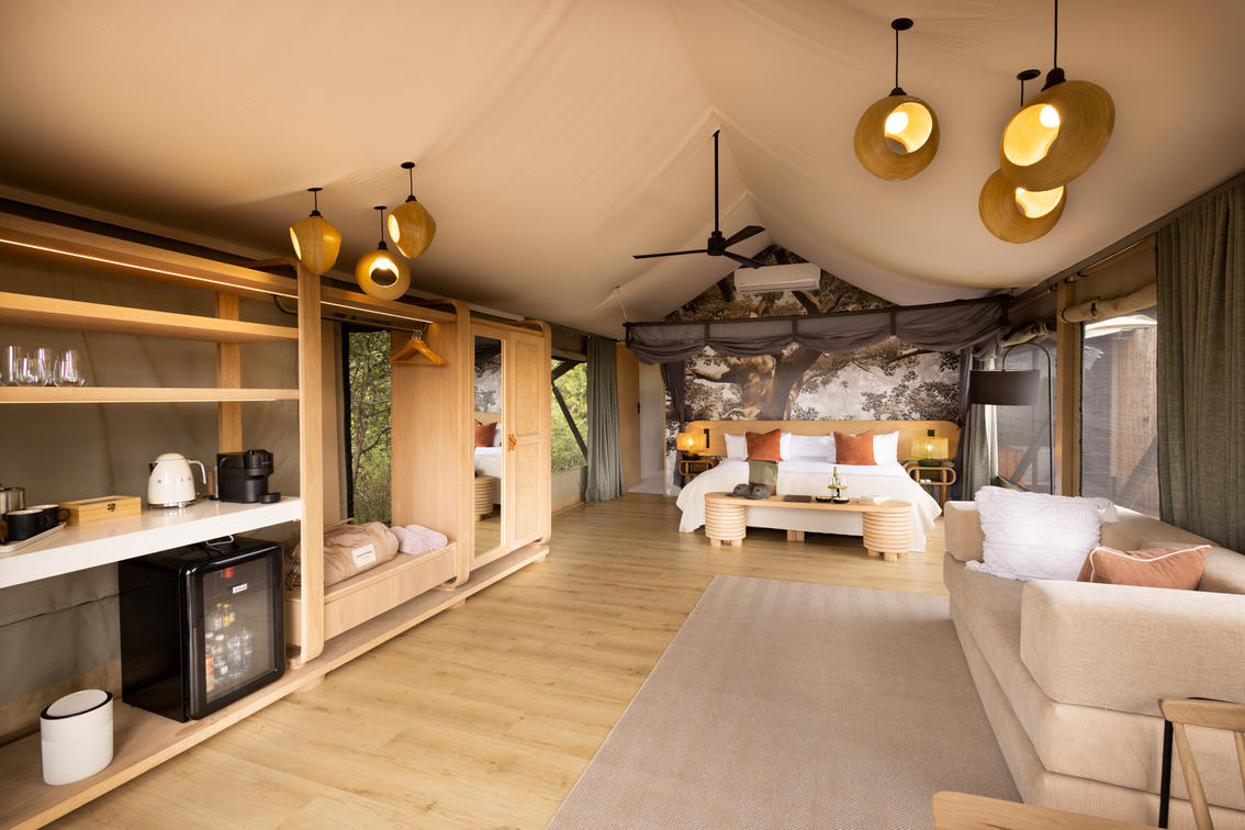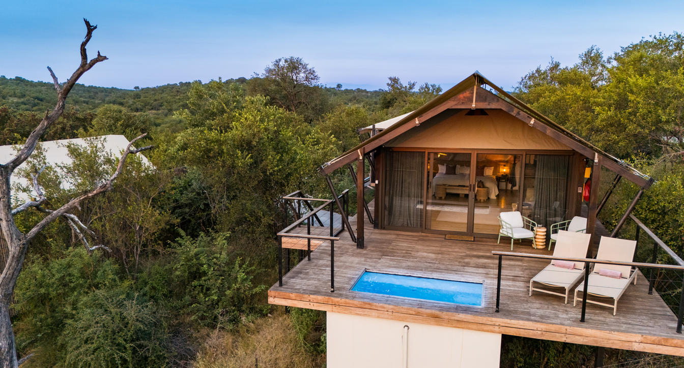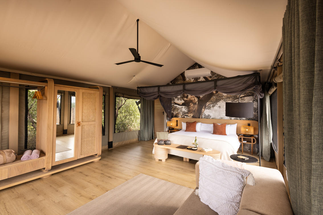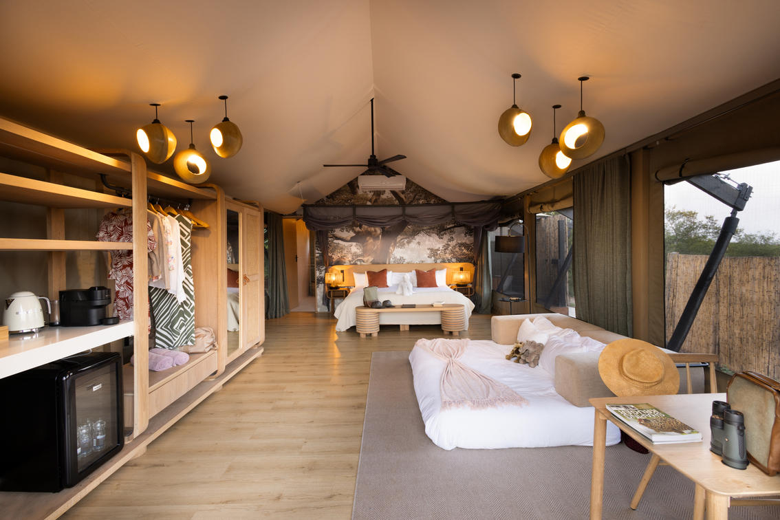 Inspired by different trees indigenous to the Kruger area, the tented suite includes an extra length Super King bed (can split into 3/4 beds) and a sleeper couch. In addition to the luxurious modern decor, highlighting features include a plunge pool and outdoor shower.
