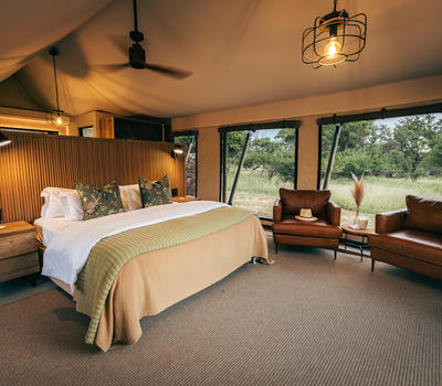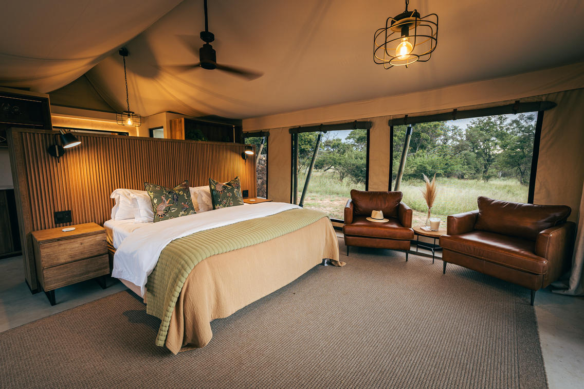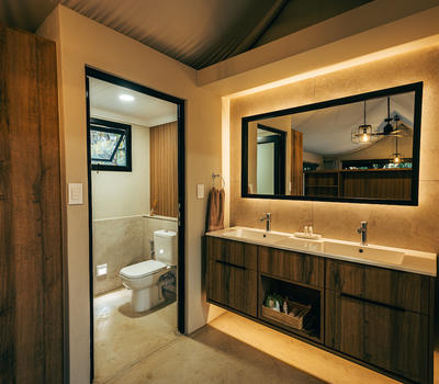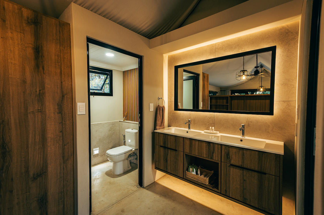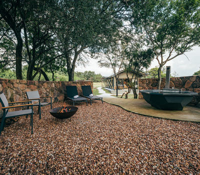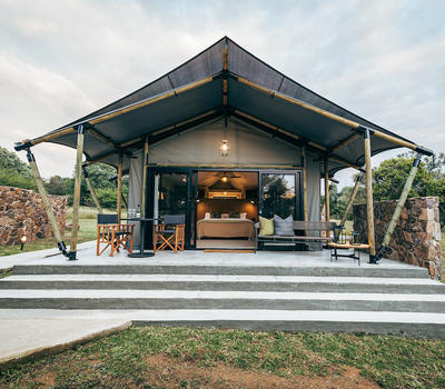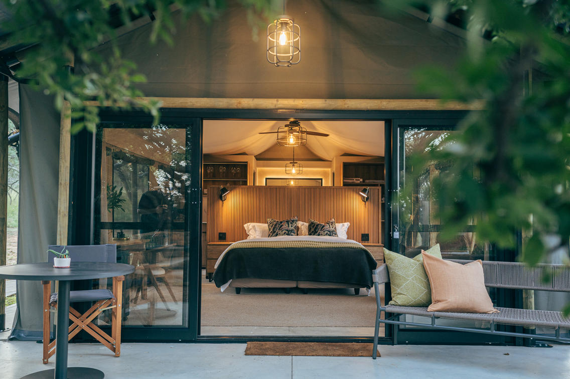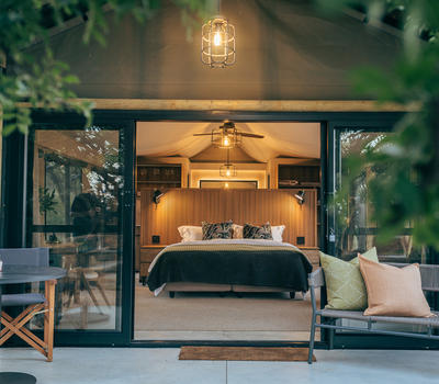 The Hideout Tent offers a peaceful bush escape for two. Each premium private tent includes a shaded patio, wood-fired hot tub and king-sized bed — a Wi-Fi-free haven to slow down, unwind and reconnect with nature.