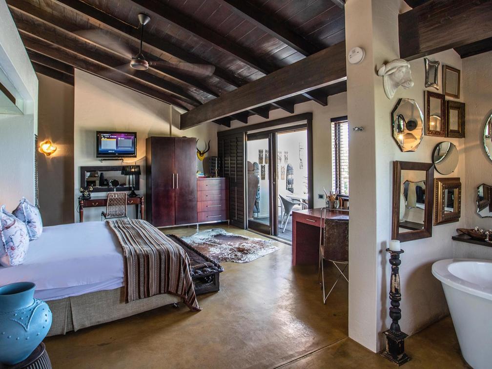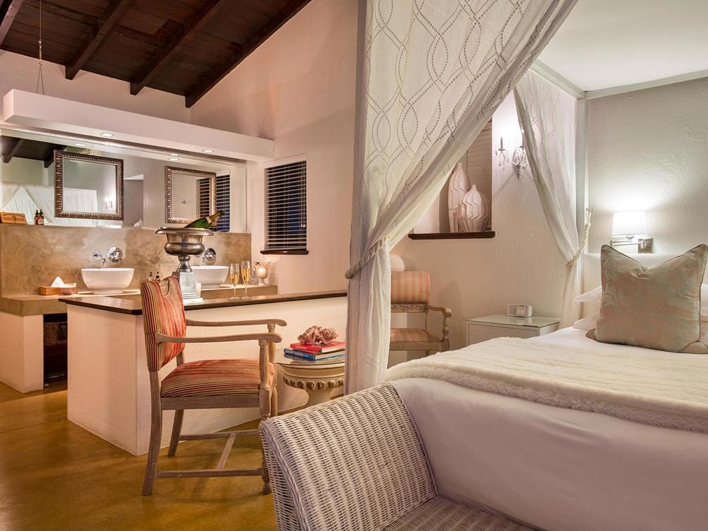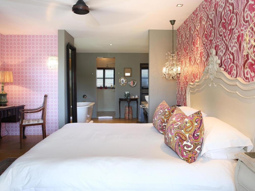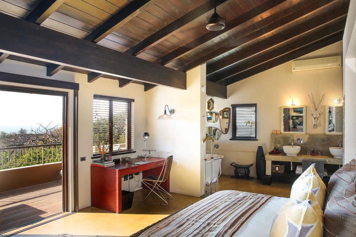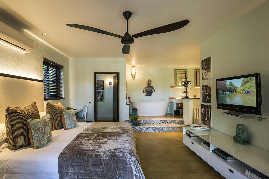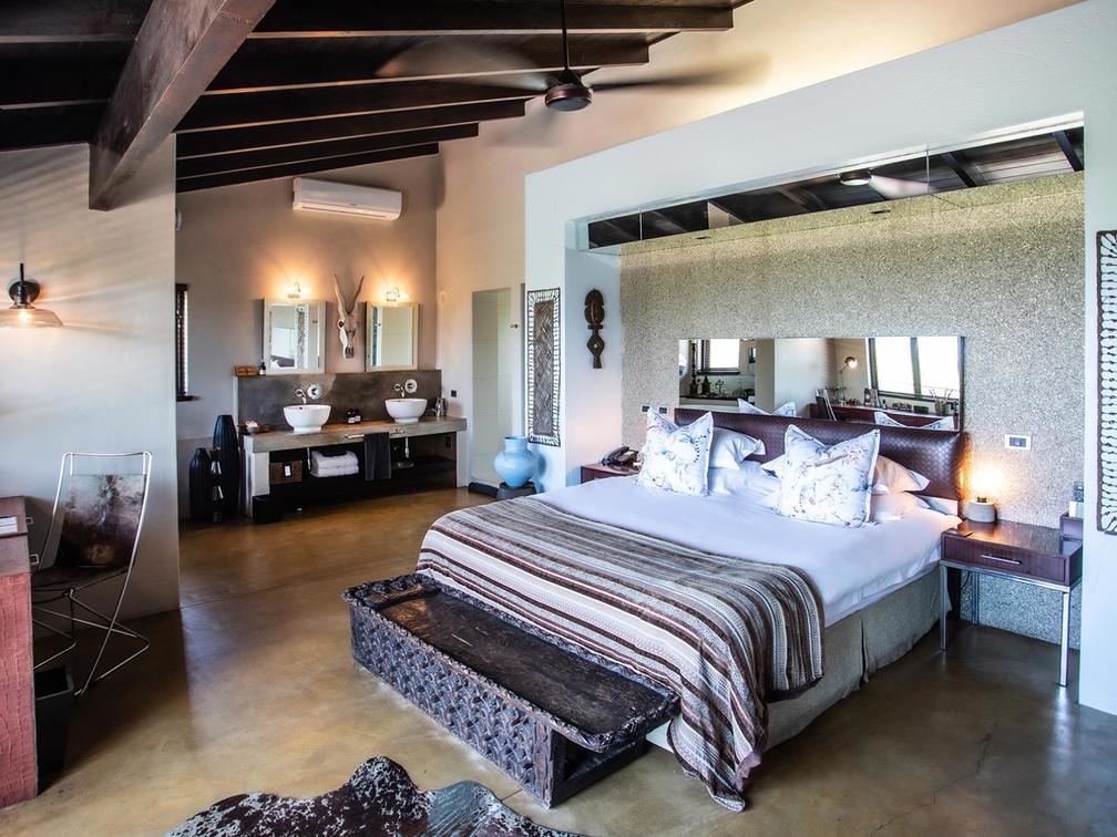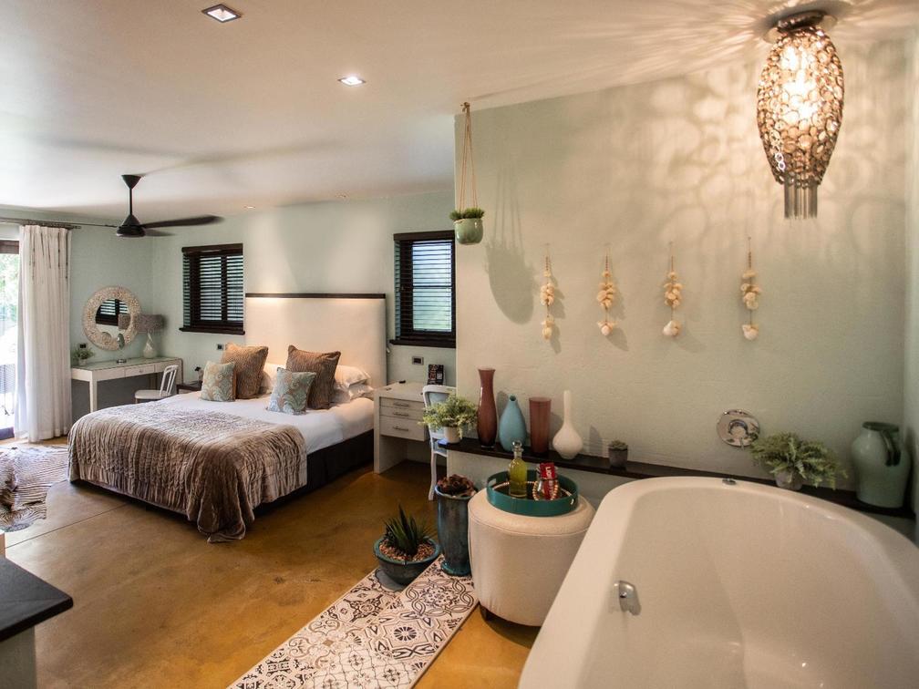 The African-zen-inspired top-level suite has an ocean view, king bed, private balcony, air-con, fan and a TV. An open-plan bathroom with freestanding bath, large shower, twin basins & separate toilet/bidet. Free Wi-Fi, laundry, tea & coffee.