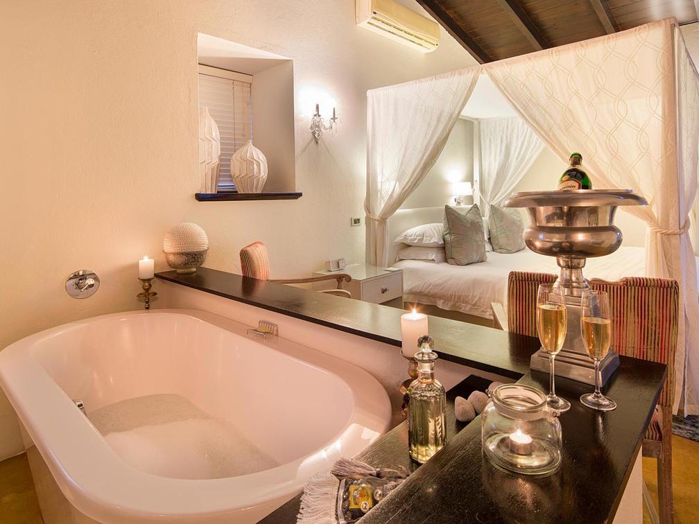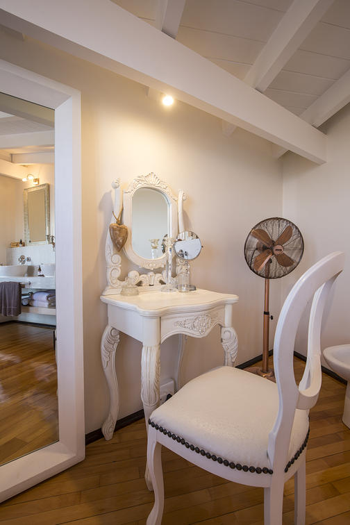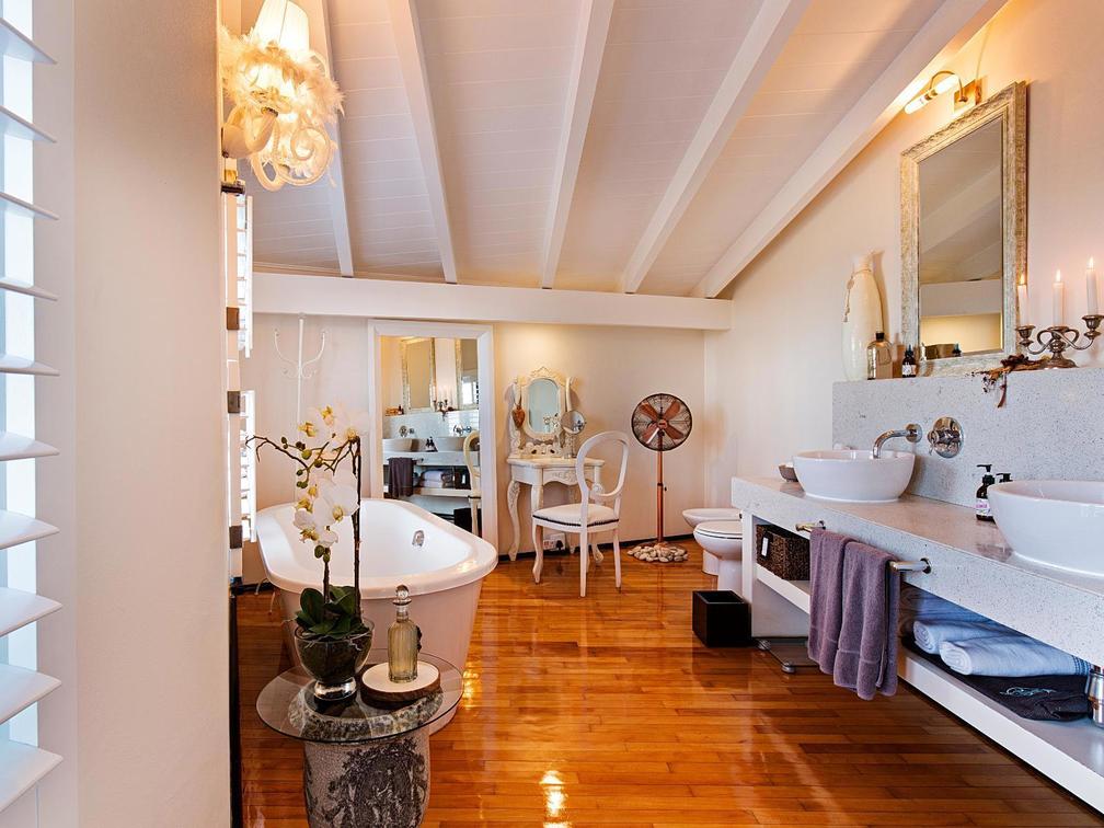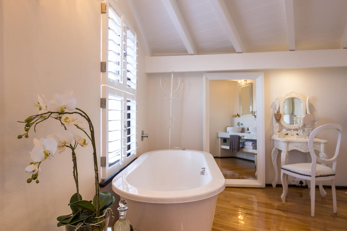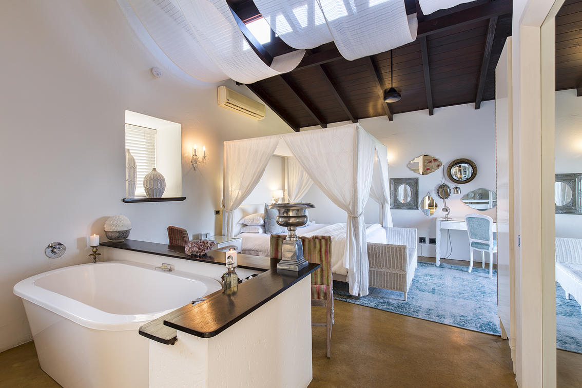 Romantic, airy suite on the top level with sea view, king bed, furnished private balcony, air-con and a TV. An open-plan bathroom with freestanding bath, large shower, twin basins & separate toilet/bidet. Free Wi-Fi, laundry, tea & coffee.