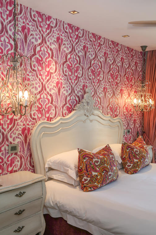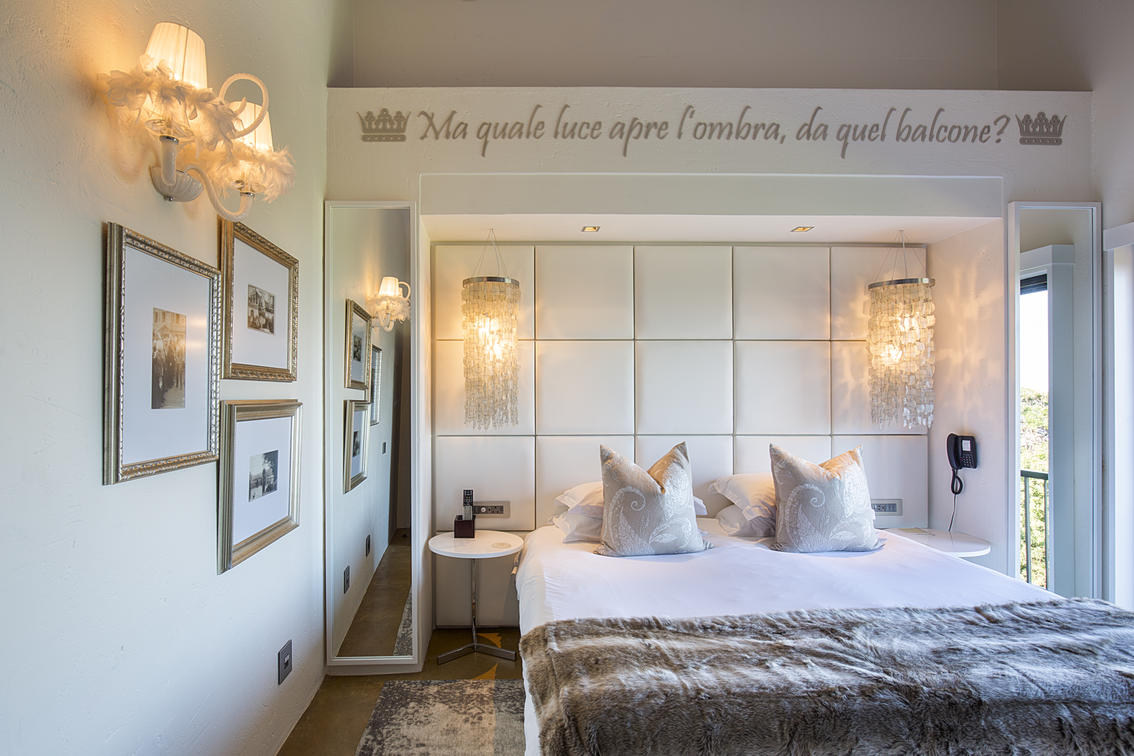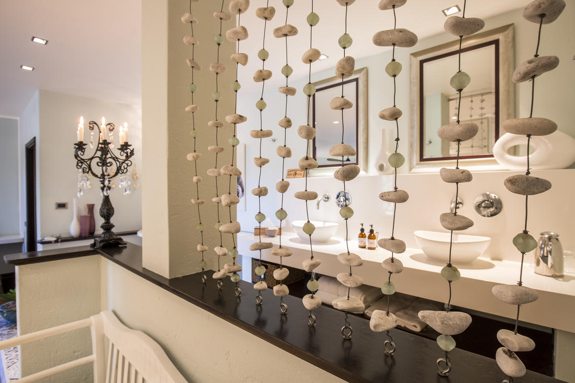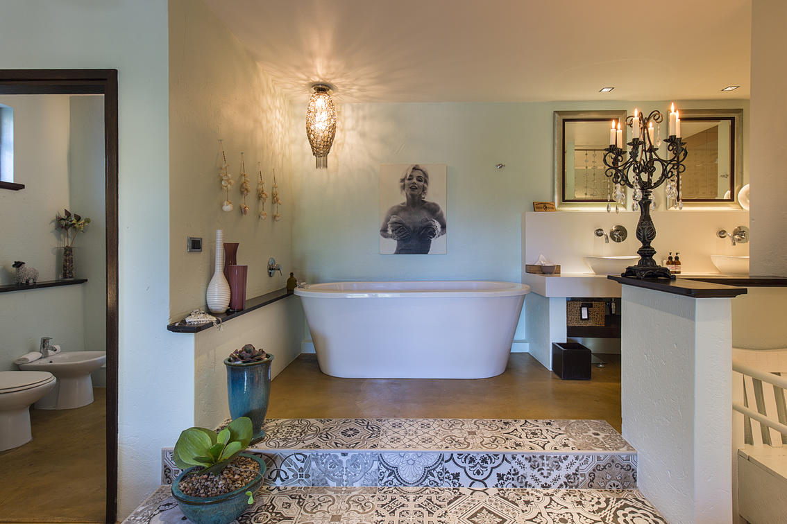 Romantic, airy suite on the top level with sea view, king bed, furnished private balcony, air-con and a TV. An open-plan bathroom with freestanding bath, large shower, twin basins & separate toilet/bidet. Free Wi-Fi, laundry, tea & coffee.