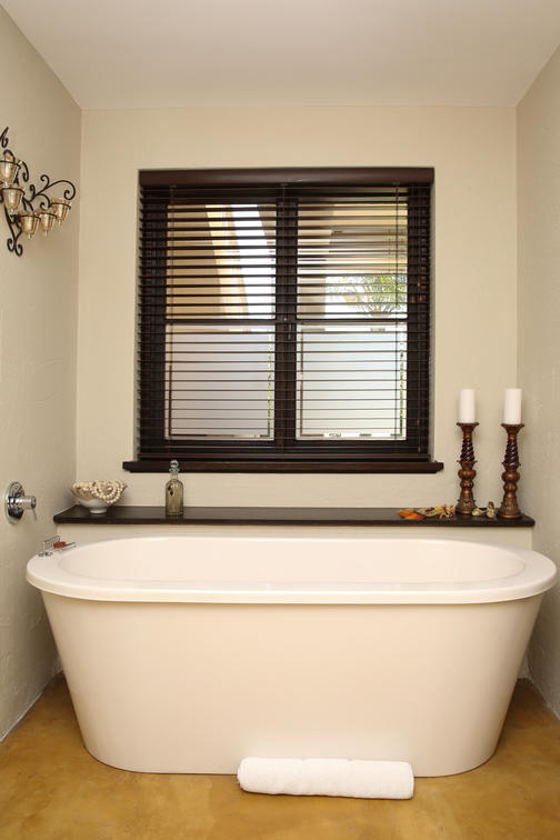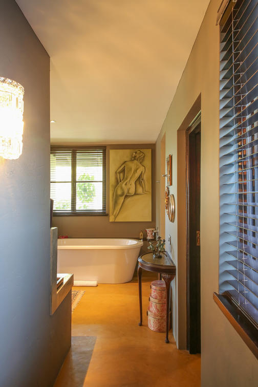 Quiet, contemporary suite with furnished patio opening onto the communal pool & garden. King bed, air-con, fan and a TV. An open-plan bathroom with a freestanding bath, large shower, twin basins & separate toilet/bidet. Free Wi-Fi, laundry, tea & coffee.
