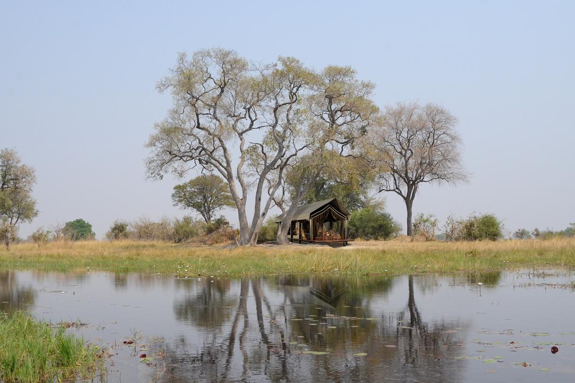Traditional-style Meru tent positioned with its front deck maximising views onto the adjacent Karangoma Lagoon and Magwegqana Channel. The tents are on low timber decks and consist of a front outdoor deck backed by a bedroom and en-suite bathroom with safari-style shower and toilet. Lighting, a fan and charging points are powered by solar energy.
