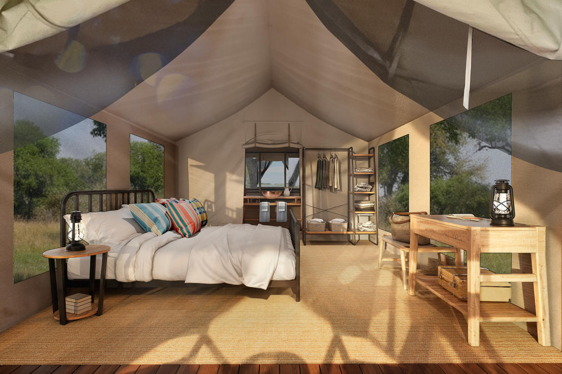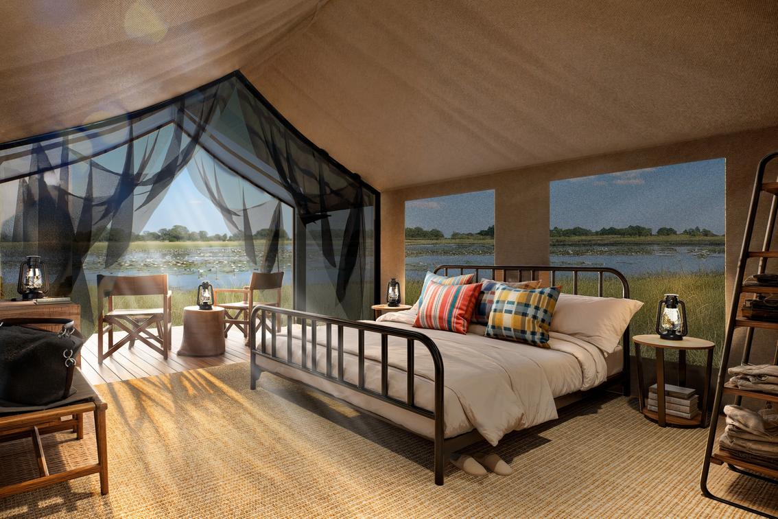 Identical to a standard guest room: Traditional-style Meru tent positioned with its front deck maximising views onto the adjacent Karangoma Lagoon and Magwegqana Channel. The tents are on low timber decks and consist of a front outdoor deck backed by a bedroom and en-suite bathroom with safari-style shower and toilet. Lighting, a fan and charging points are powered by solar energy.