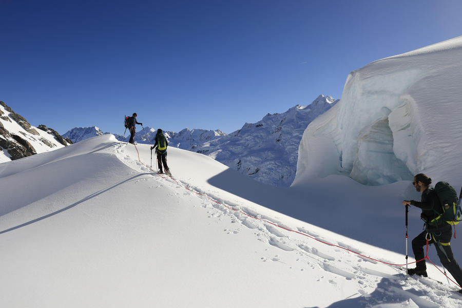A rare alpine experience accessed by private helicopter, landing high on the upper neve of the Tasman Glacier in Aoraki / Mount Cook National Park.