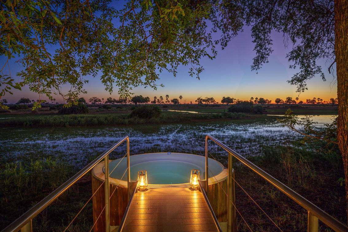 Full-height sliding doors extend to the steel ring beam, opening onto an expansive private deck with a private plunge pool overlooking the surrounding channel and floodplains. The elevated position offers sweeping Delta views and exceptional privacy, with wildlife often visible directly from the suite.