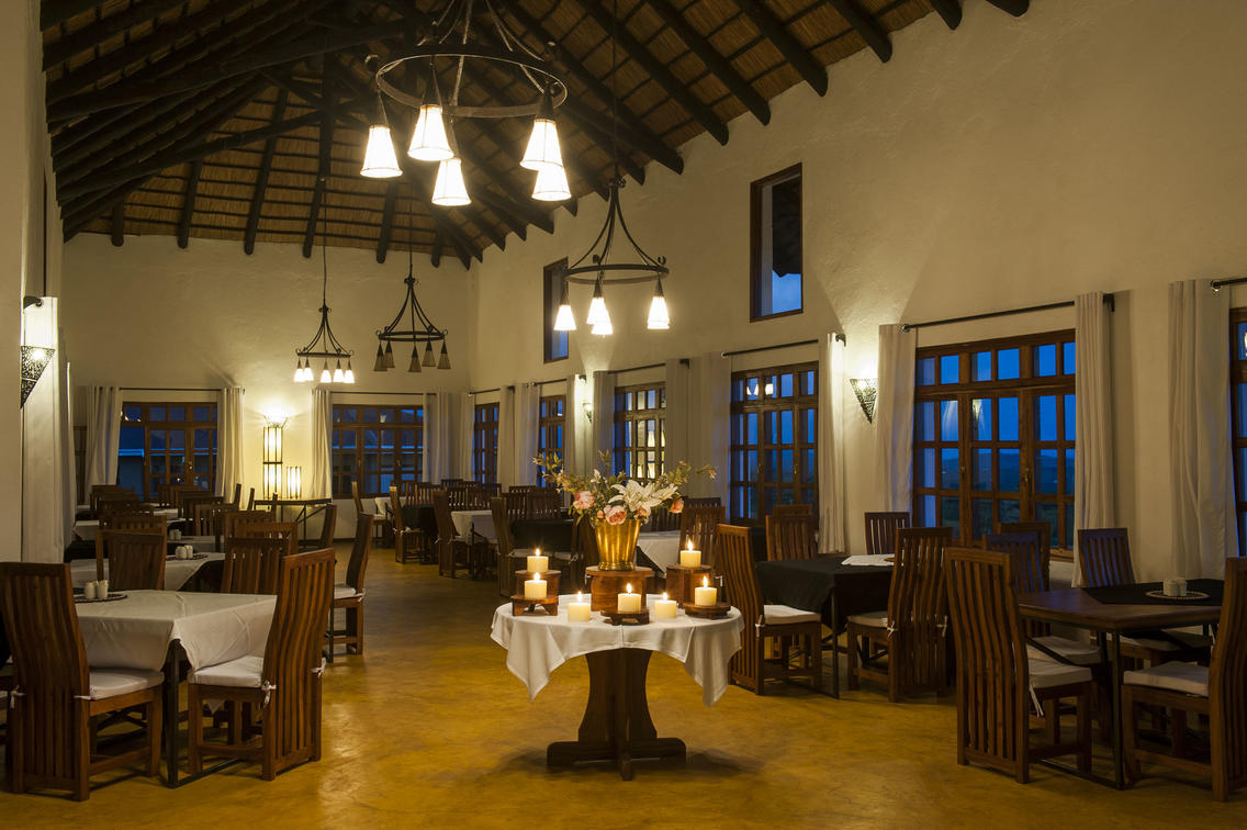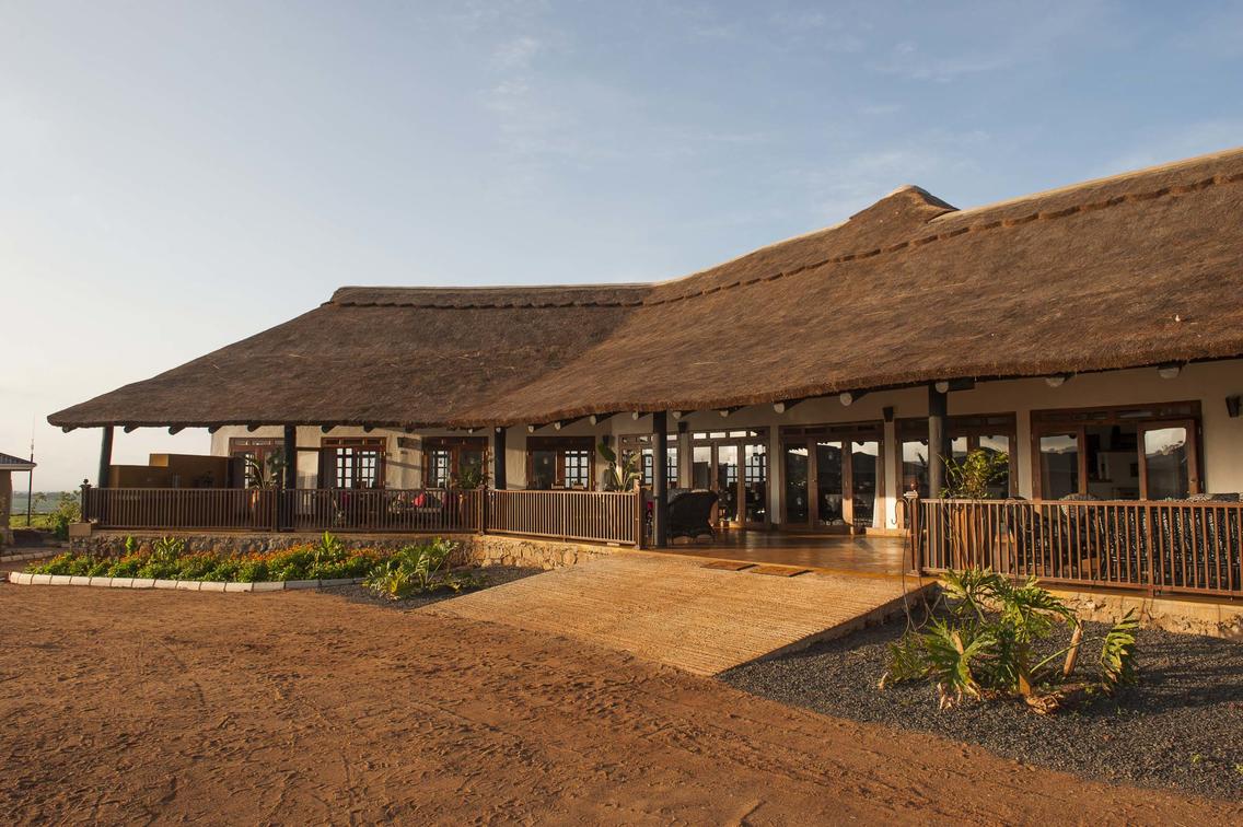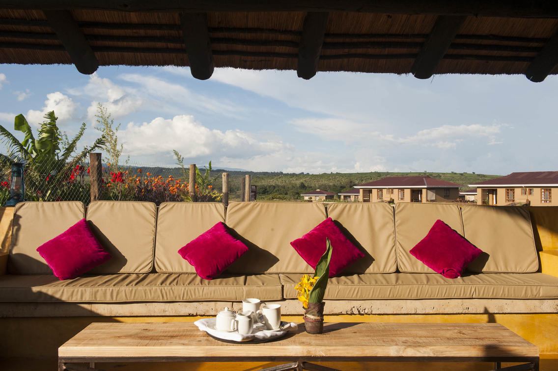 The main building, covered with an elegant thatched roof, contains the lounge, restaurant and a big deck which offers spectacular views of the Oldeani Volcano.