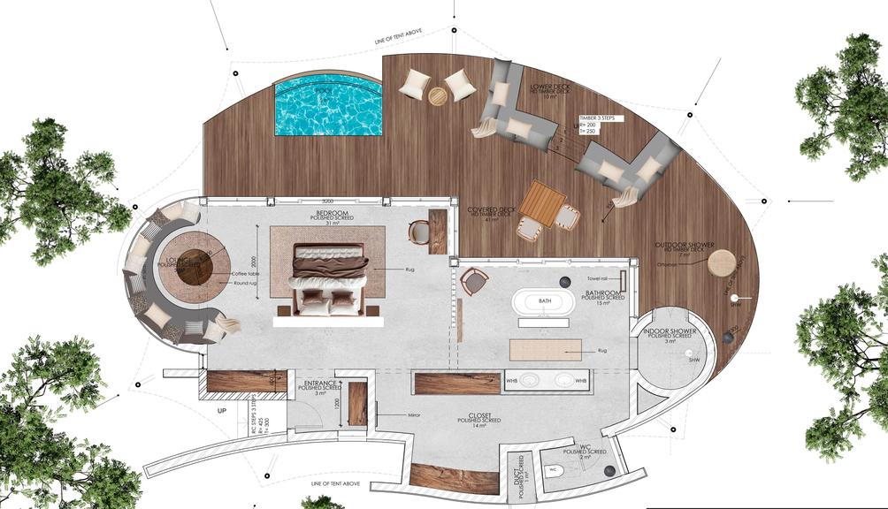 Each suite reflects the natural tones of the surrounding wilderness, with earthy browns, soft greens and calming neutrals. Polished screed floors, natural stone, textured finishes and warm timber details create a tactile, grounded atmosphere that connects seamlessly with the landscape beyond.