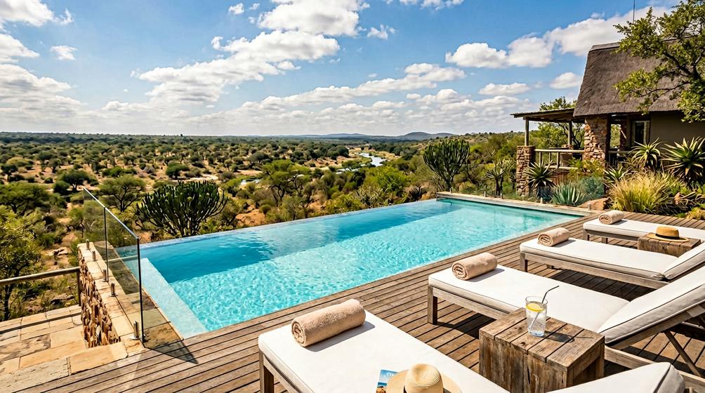 The property features 18 accommodation units across four room categories, a central lapa with panoramic bush views, an infinity pool, a curio shop, and a full-service spa. All rooms are built from natural stone and thatch in harmony with the landscape, and the lodge carries an internationally recognised Green Tourism Certification.