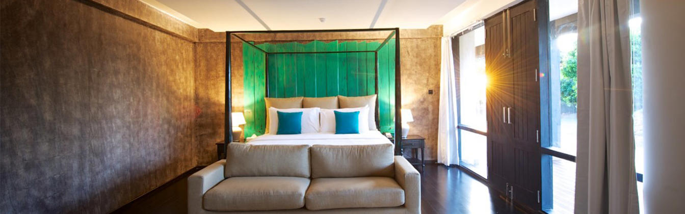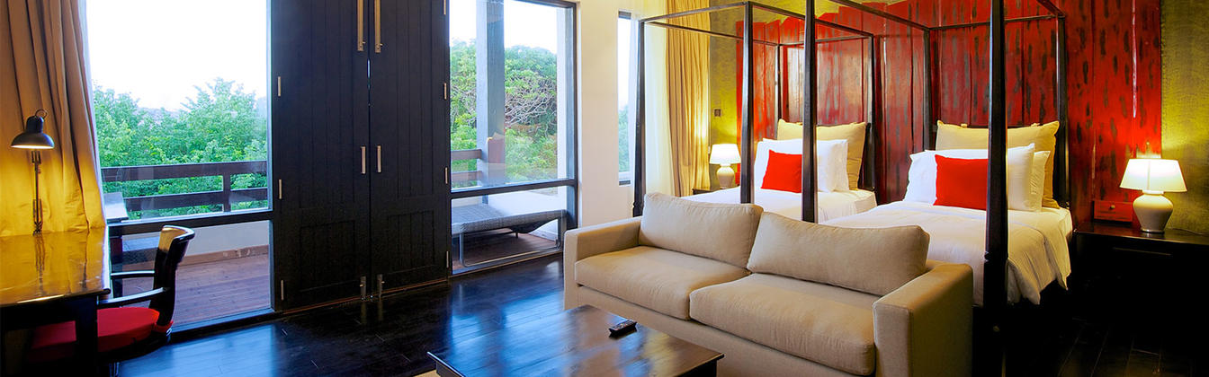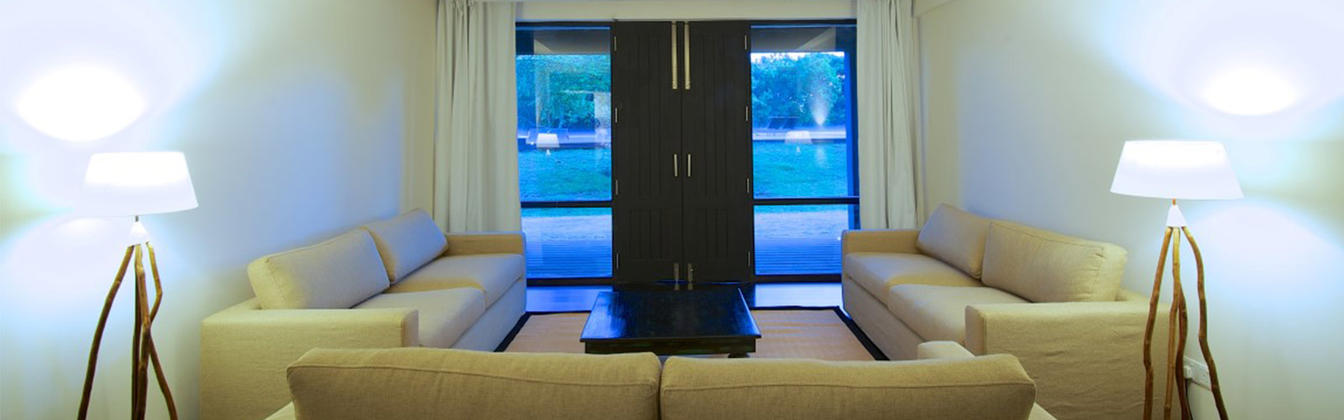 Enjoy views of the wild from the safety and luxury of a plush Jetwing Yala Family Room. The room features include large bed, private sitting room and svelte bathroom.