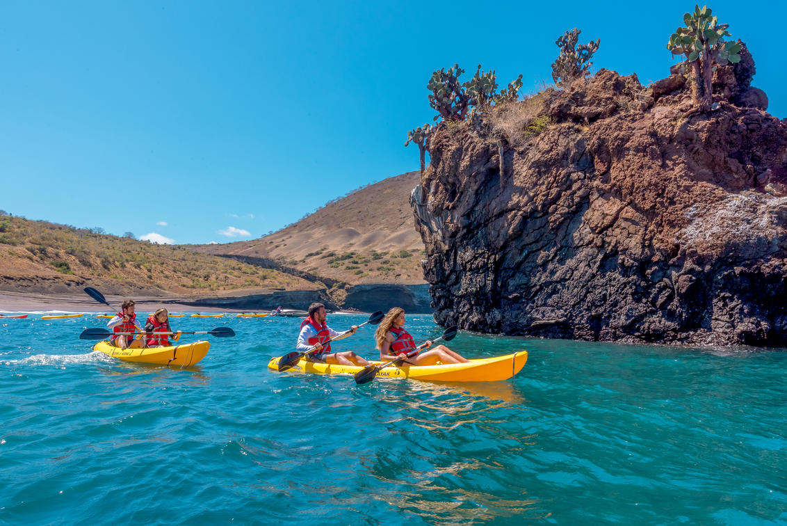 Our kayaking program takes place in Divine Bay, a beautiful location with protected waters that make for a pleasant trip. We leave when the tide is high from Playa de Los Alemanes (German Beach), located by Finch Bay – one of the advantages of staying at the only beach-front hotel in Santa Cruz! Paddling around the waters of the Marine Reserve is a great way to get some exercise and spot unique endemic wildlife. Birds rest on the cliffs that form the edges of the islands. Sea lions and their pups lie meters away on the beaches.