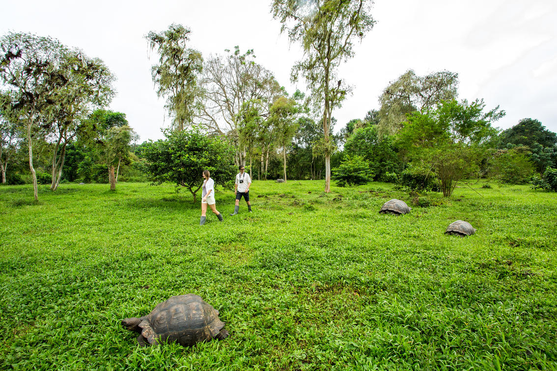 Giant tortoise reserve located in the highlands of Santa Cruz Island. The area is teeming with life: woodpeckers, mockingbirds, flycatchers, ducks, and gallinules make this an exciting morning visit. The Galapagos giant tortoise is the largest living tortoise species, weighing up to 250 kg (550 lb). These gentle giants can be seen grazing on the surrounding vegetation, wallowing in muddy banks, or in a small red-colored pond (impressively colored by surface red pondweeds).