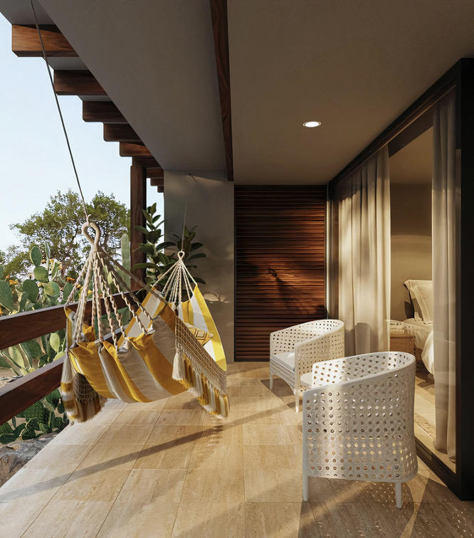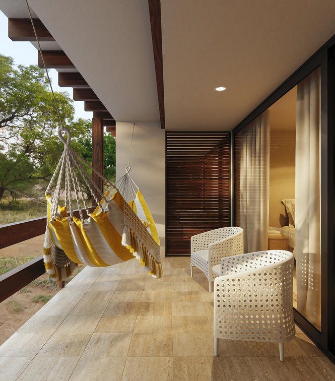 Arranged in a half-circle around one of the Hotel’s gardens and accessed by a wooden walkway, these rooms are fantastic for solo travelers or guests traveling in pairs or as a couple. All rooms have a small patio area right outside with a hammock.