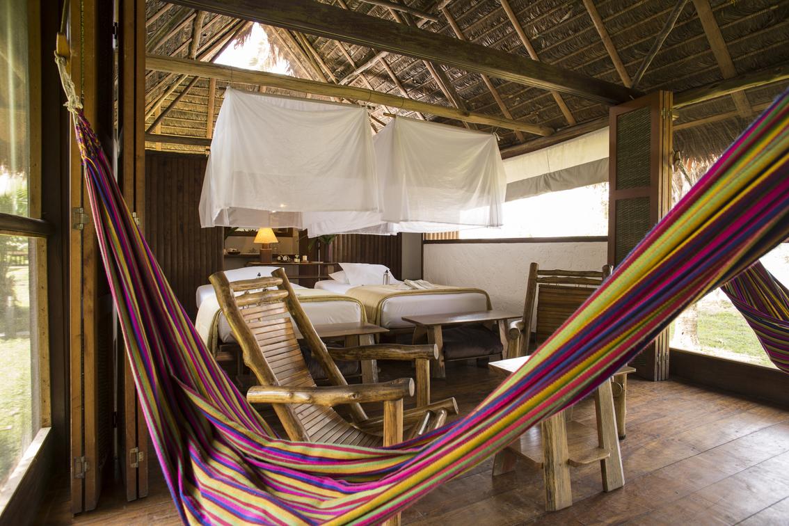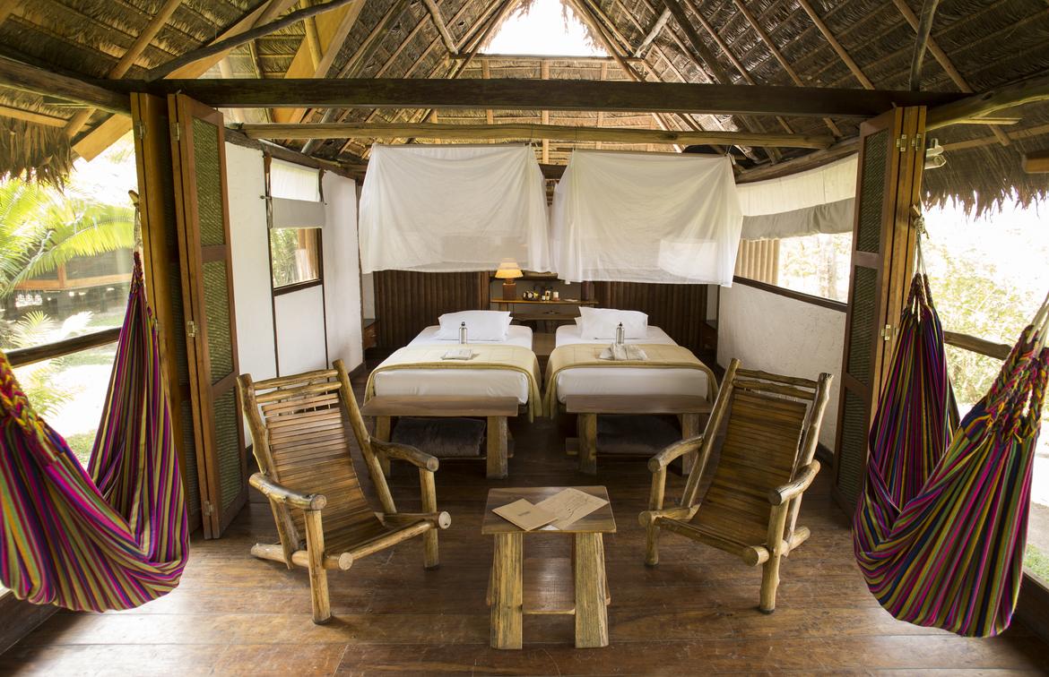 Delight in the luxurious amenities of the open plan bathroom with a separate shower and toilet, double basins, hot water, lush towels, and a whole set of ecologically friendly toiletries. Stay for a slumber in the screened siesta lounge furnished with hammocks. Your Tambopata stay offers you the ultimate in amenities and convenience in the seclusion and splendor of the Southern Amazon.