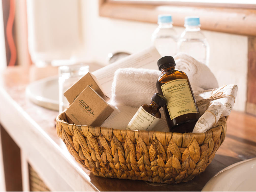Soak up in the soothing and spacious bathroom with independent shower and toilet, hot water, large towels, and a complete set of ecologically friendly toiletries. Put your feet up and loosen up on the hammock of the screened siesta area. For your rainforest foray, your cabaña is equipped with umbrellas, flashlights, kerosene lamps for lighting, a central ceiling fan and an electric outlet.