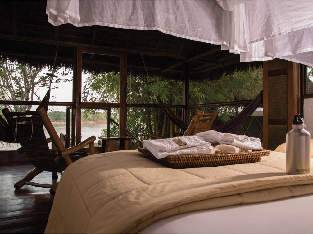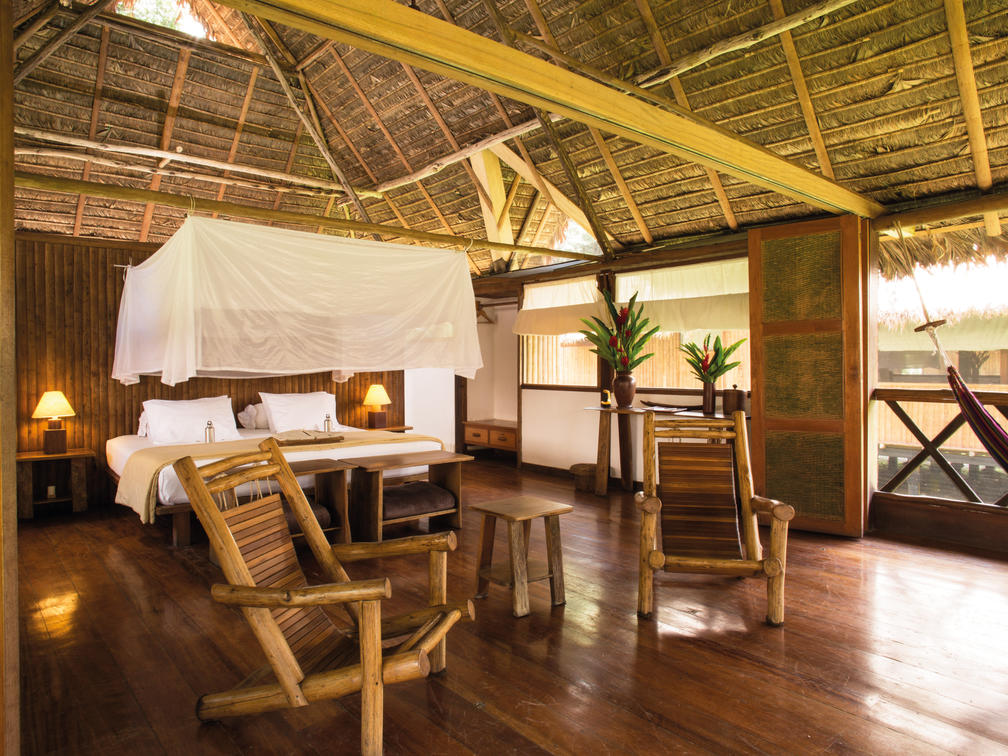 Consider creature comforts and charming conveniences at these restful Ese' Eja-style wooden cabañas of 38 square meters (408 square feet), topped by a high thatched-palm roof. Stay in a twin or king bedroom with canopy mosquito net, outfitted with 100% cotton sheets and hypoallergenic pillows. For your added comfort, plush bathrobes and Andean rubber slippers are supplied.