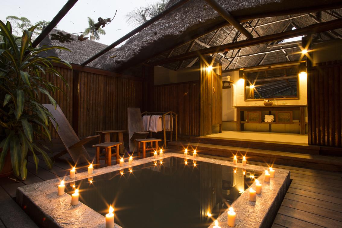 Your rainforest retreat comprises a private covered terrace with plunge pool, plus sunbathing chairs and outdoor shower in four integrated areas in a comfortable Ese’ Eja style wooden cabaña with tall fishtail palm rooftops. This suite has 1 king or twin beds, graceful canopy mosquito net, all cotton sheets and hypoallergenic pillows. Added for your comfort are plush bathrobes and Andean rubber slippers along with rainforest gear such as umbrellas, flashlights, kerosene lamps and ceiling fan.