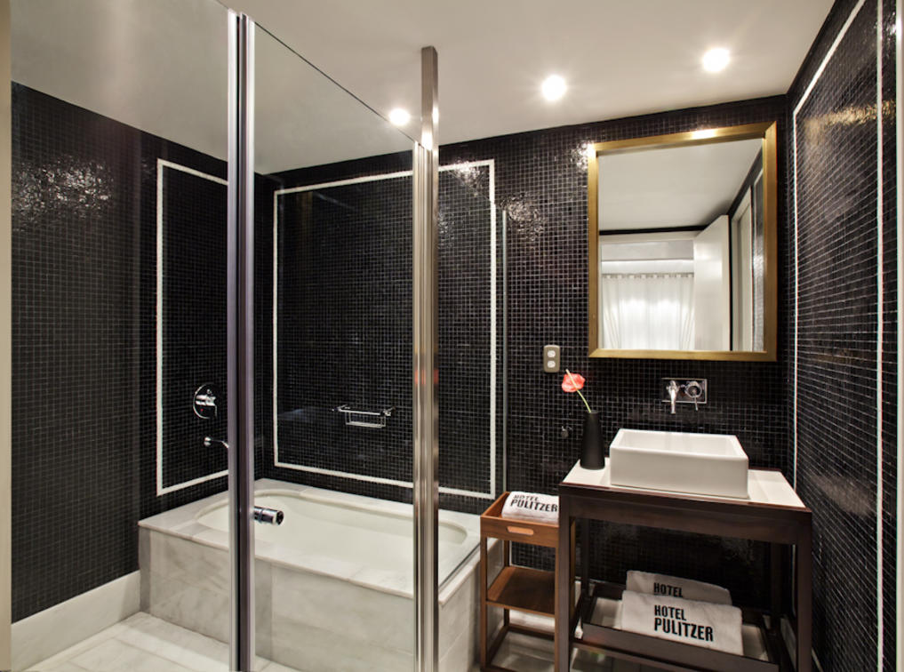 A luxurious diversity of soft and fluffy carpets, plus a large bathroom in grey marble and black ceramic, will offer a real heaven for your feet after a whole day walking around the city.
