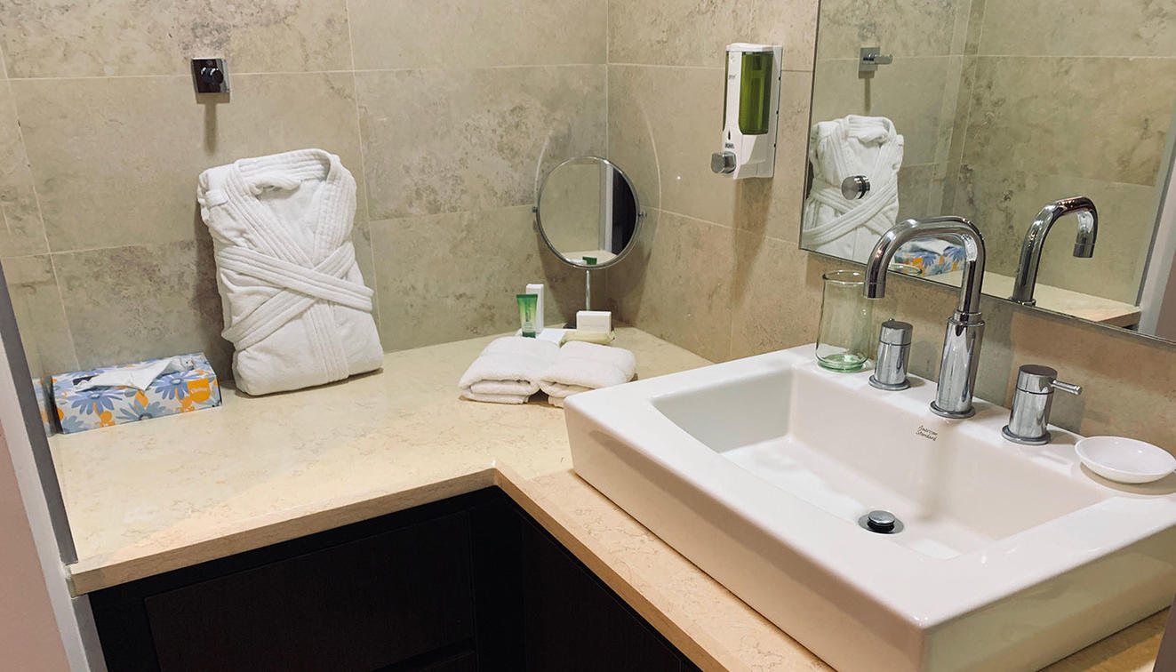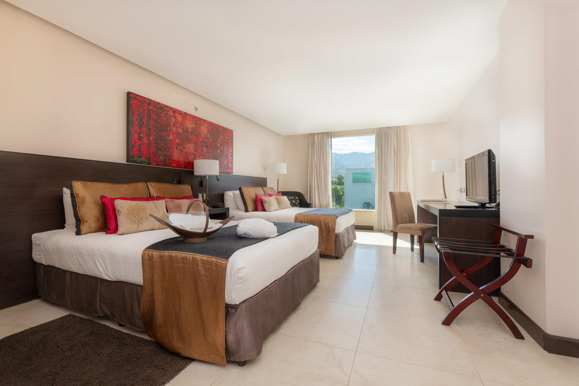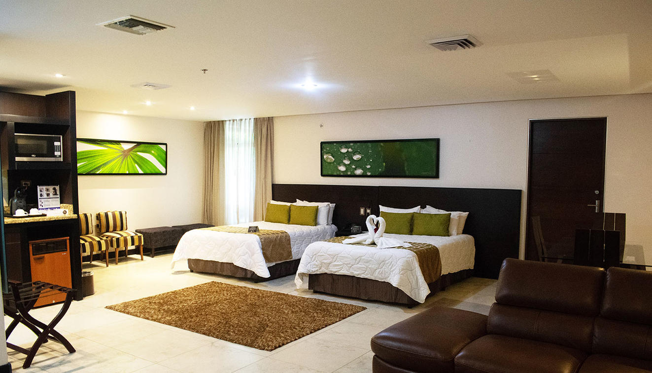 Cozy and spacious rooms with 2 Full size beds, dining table for 4 people and a sofa area, approximately 45m2, decorated with exquisite art works. This room could be connecting to a standard room.