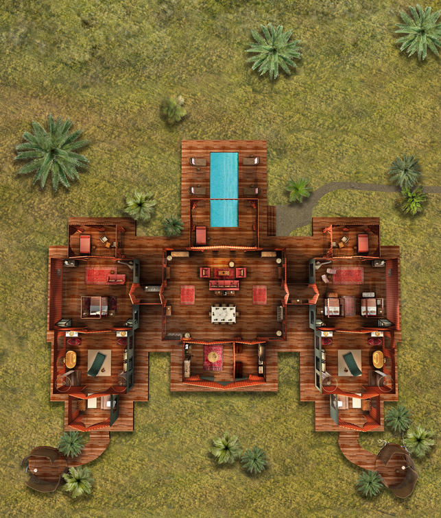 Jack’s Private Camp has two bedrooms, each with their own en-suite bathroom, private veranda and day bed. One room will have an extra length king size bed (double) and the other, two extra length king size beds (to use as twin or double), with over bed cooling systems and mosquito nets. The en-suite bathrooms each have two indoor showers, a brass bathtub and an outside shower. Between the bedrooms is a shared living space, with a kitchen, dining area and lounge - leading out onto a private deck with a large swimming pool, overlooking the Makgadikgadi Pans.