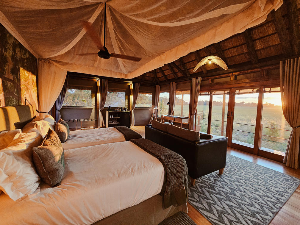 Guests are accommodated in seven spacious twin and double-bedded safari tents, each en-suite bathroom has a large walk-in shower and luxurious fittings.